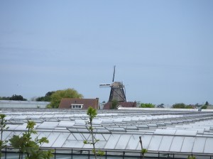 Hoek van Holland; De Nieuwlandse molen uit 1574 is in 1985 5,6 meter verhoogd om boven de kassen uit te blijven steken (foto: René Hoeflaak)
