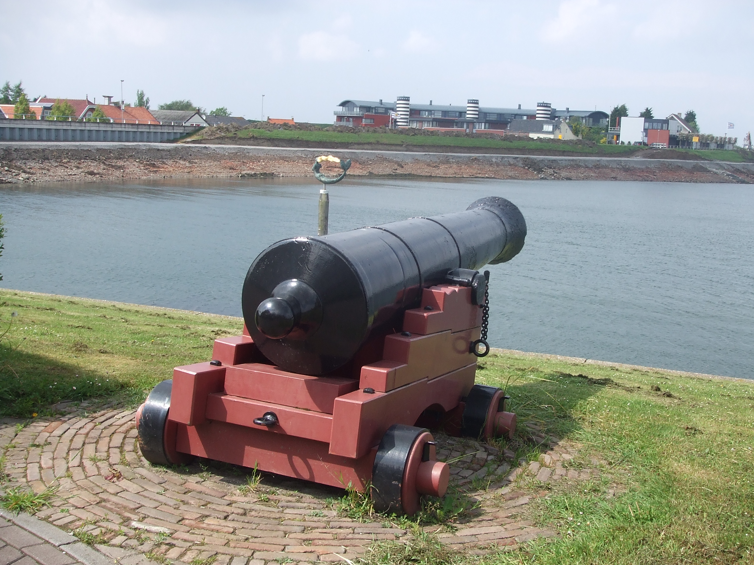 Over de zeedijk rijden we in oostelijke richting naar Wemeldinge. Het is rustig op de “dijk” . Bij beter en zomers weer is het hier druk met Belgen (die duiken) en Duitsers (die Kitesurfen). Vanaf morgen, 31 mei, is de dijk tijdelijk gesloten in verband met herstel werkzaamheden. In Wemeldinge is meer te beleven dan in Kattendijke. Wemeldinge telt 3.100 inwoners, heeft enkele jachthavens, een boulevard en historische molens. Bij het oude sluiswachtershuisje waken twee kanonnen over een zeemeermin, zo zie ik met eigen ogen.