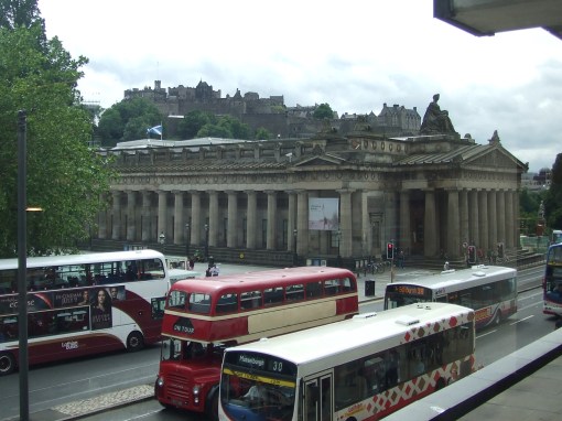 Edinburgh, vrijdag jl; Bussen rijden langs The Royal Scotisch Academy, op de Princes Street (foto: René Hoeflaak)