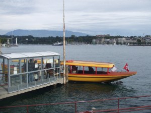 Genève; Vanaf de Quai Mont Blanc nemen we een watertaxi naar de Noord-Oever van de Rhône (foto: René Hoeflaak)