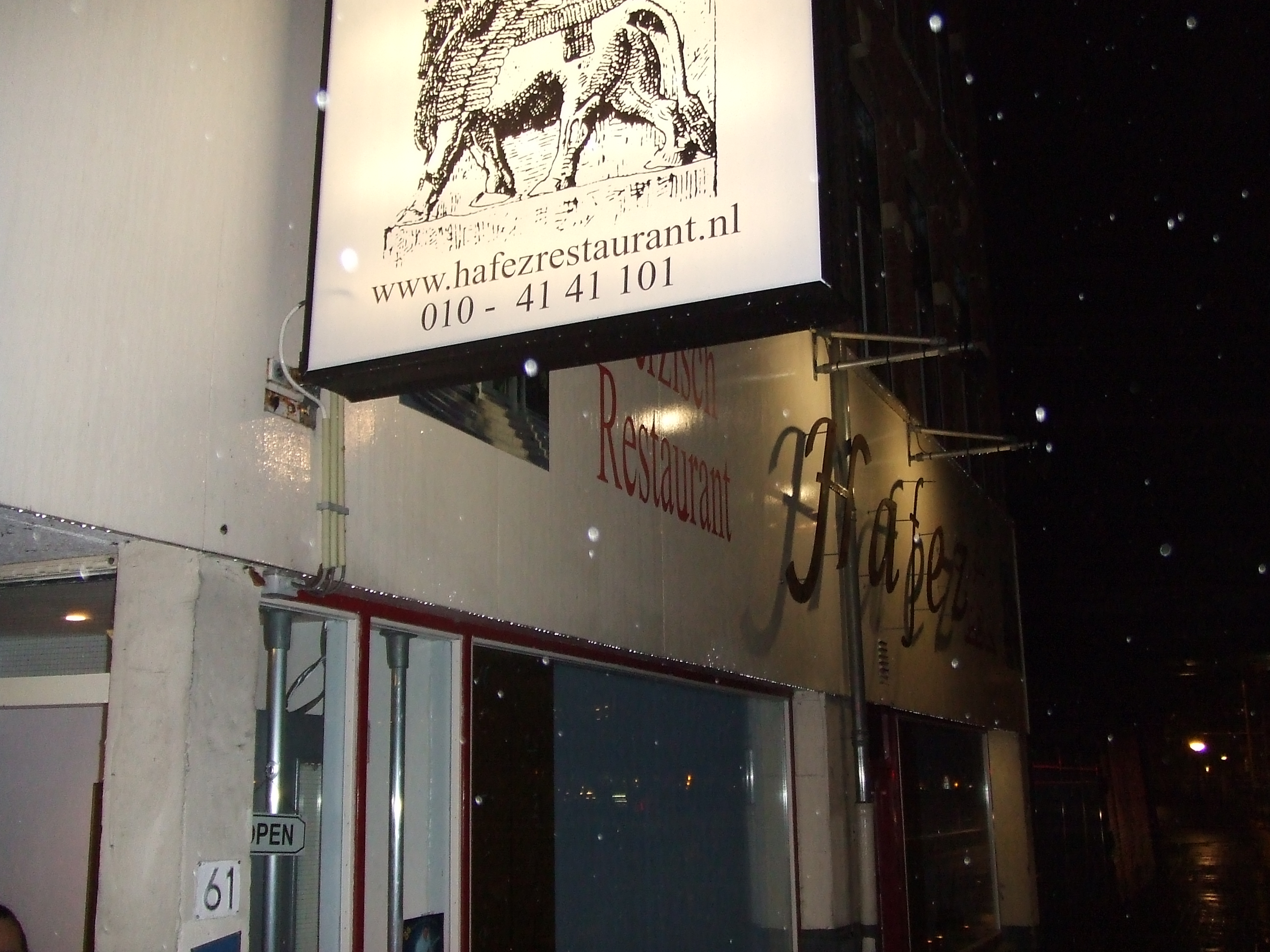 Regelmatig wandel of rijd ik langs Perzisch restaurant Hafez aan de Prins Hendrikkade in Rotterdam en neem ik mij voor een keer naar binnen te stappen. Gisteravond was het dan zover en maakten wij kennis met de Iraanse keuken. Terwijl het buiten stormt op het Noordereiland en de regen op het asfalt klettert, nemen wij plaats aan één van de vele lege tafels. Slechts vijf tafels zijn bezet. De Rotterdammers hebben de weg naar Hafez nog niet gevonden. Dat is jammer en onterecht. Hafez blijkt een prima adres voor een sfeer- en smaakvol avondje. Om van alles wat te proeven bestellen we een Grill Hafez, een Perzische mixgrill variant met djoedje (kipfilet), koebideh (lamsgehakt) en shishlik (lamskoteletten) en daar hebben we geen spijt van. Dit gerecht wordt geserveerd met rijst, aangevuld met twee tomaten en een knoflookyoghurt genaamd mast-e moshir. Iets meer groente had wel gekund. Ook andere zintuigen worden geprikkeld (en op de proef gesteld) in Hafez. Vanaf het podium, vijf meter van onze tafel, speelt een muzikantenduo tradionele Arabische muziek op typisch Arabische instrumenten als de Tar en Kanun. We besluiten onze bezoek aan Hafez met een thee mix, een bordje met Iraanse koekjes. Tevreden verruilen we een avondje Perzië voor de Hollandse storm een regen. Tot een volgende keer. Zie ook: http://www.hafezrestaurant.nl/