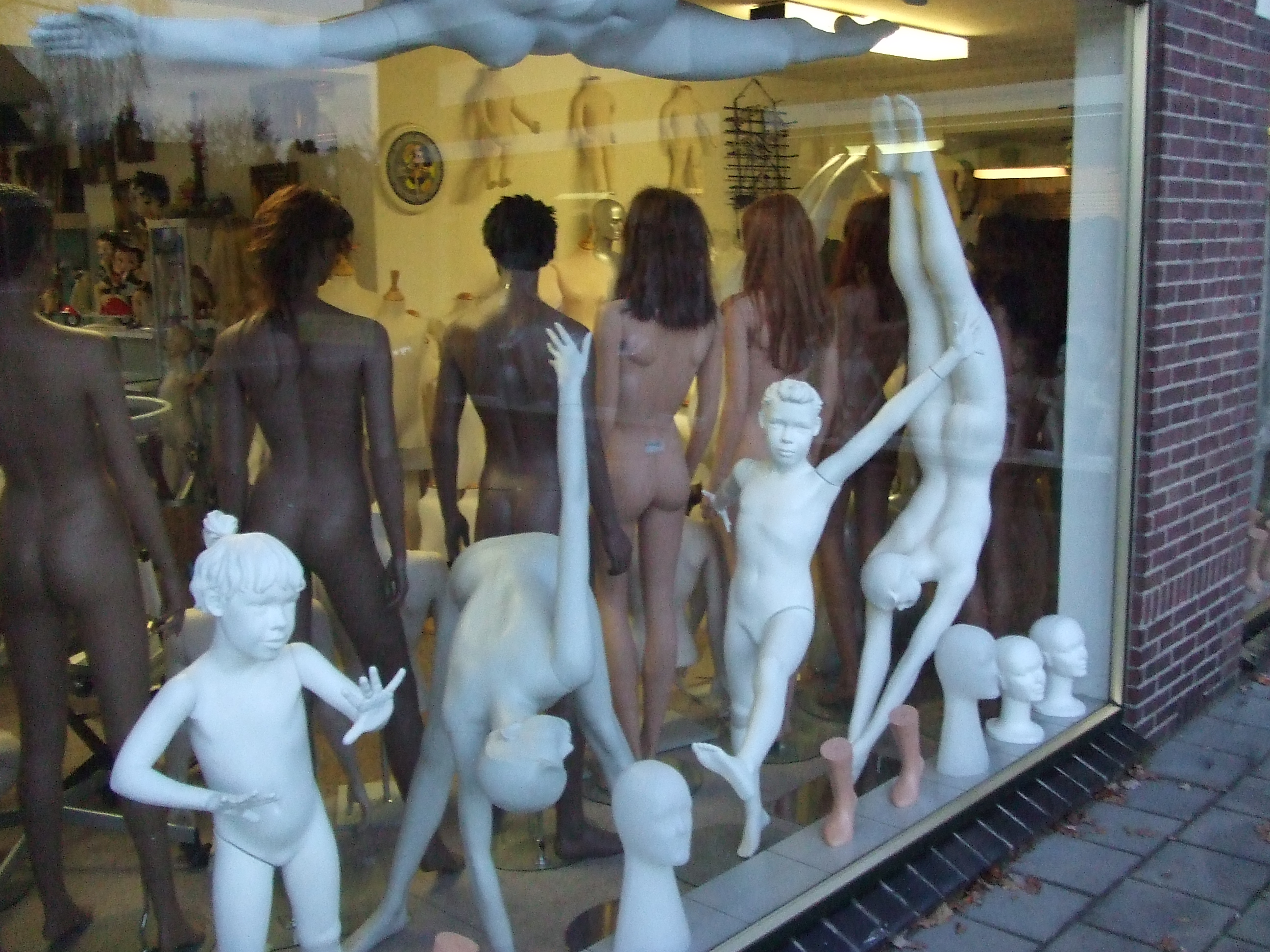 Dit weekend in Beekbergen. Vanuit hotel “Smittenberg” steken we de vrijdagavond wat onwennig de Arnhemseweg over. Zie: http://www.desmittenberg.nl/ Terwijl de temperatuur daalt, zien we even verderop, aan de ander kant, een niet alledaagse winkel. Het betreft hier de in- en verkoopwinkel van Konink, de specialist in gebruikte etalagepoppen (vanaf € 85,00), paspoppen (vanaf € 25,00), torso’s en bustes, met of zonder hoofd vanaf € 15,00. Er past geen pop of torso meer bij in de winkel en in de etalage, die op de hoek ligt van de Arnhemseweg en de Kerkstraat.
