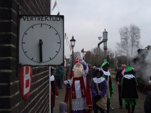 Na vijf minuten horen we gefluit en zien we stoom. We vallen met de neus in de boter. Sinterklaas blijkt in aantocht. In Beekbergen kom Sinterklaas namelijk met de trein. “Zie ginds komt de stoomtrein”. Niet veel later stapt Sinterklaas en zijn Pieten uit de stoomtrein op het perron. De Sint poseert voor de stationsklok. De tijd staat even stil in Beekbergen.