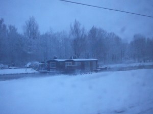 Tussen de stations raast de trein langs ingesneeuwde, verlaten boerderijen en woonwijken, witte bossen en besneeuwde weilanden. Hoe dichter bij Amsterdam, hoe harder het gaat sneeuwen. In mijn gedachten worden weilanden taiga’s, wordt Leiden Omsk en Amsterdam Novosibirk.