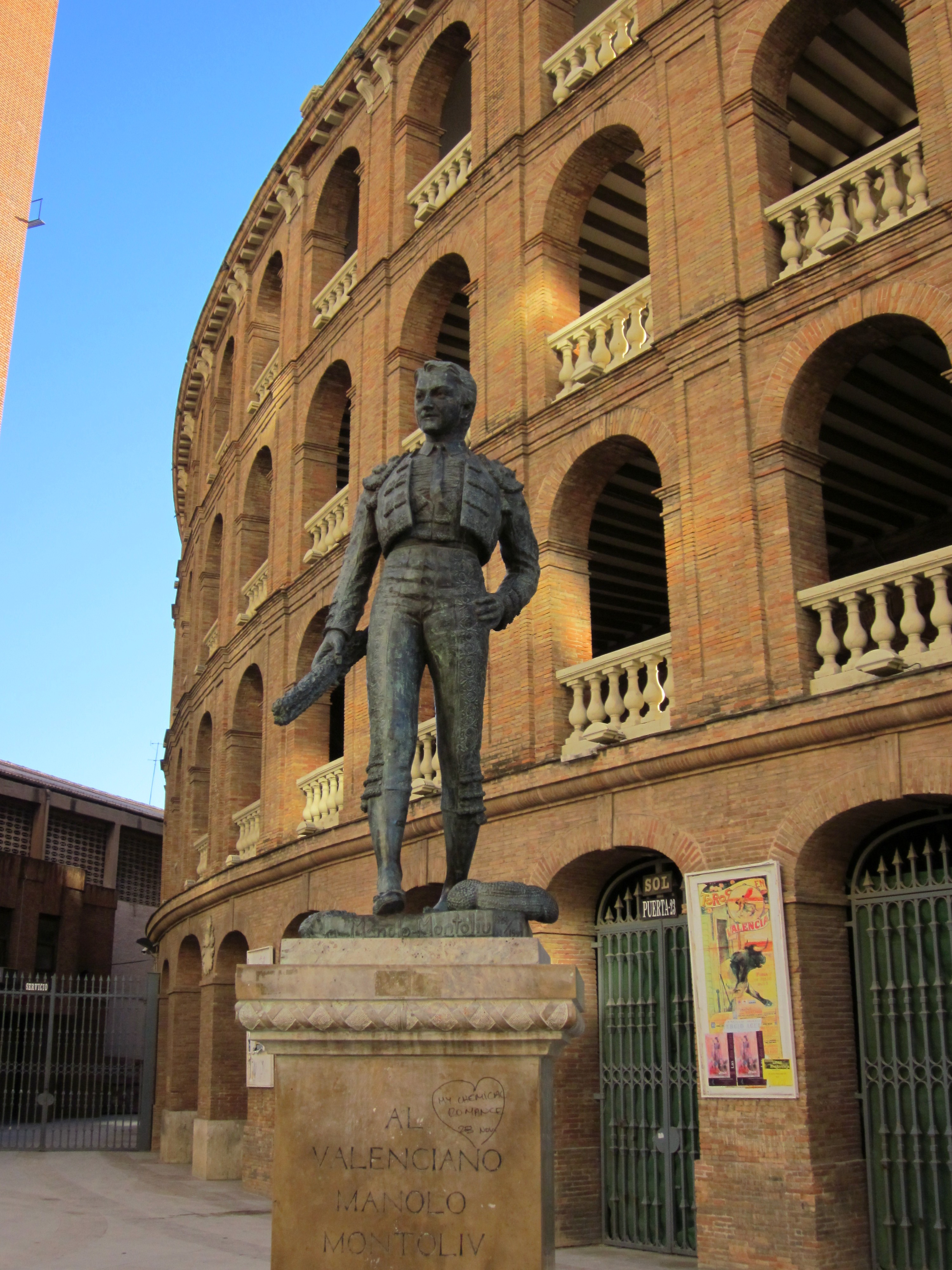 Het standbeeld voor het stadion passeer ik een aantal keer en dat maakt toch nieuwsgierig. Want over wie hebben we het hier? Het gaat om het standbeeld van Manolo Montoliu. Deze Valenciaanse matador werd in het voorjaar van 1992 tijdens een stierengevecht (toreo) in Sevilla dodelijk gespiest op de horens van Cubatisto, een stier uit de ranch van Atanasio Fernandez.