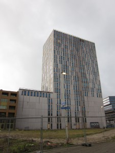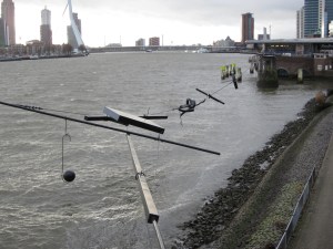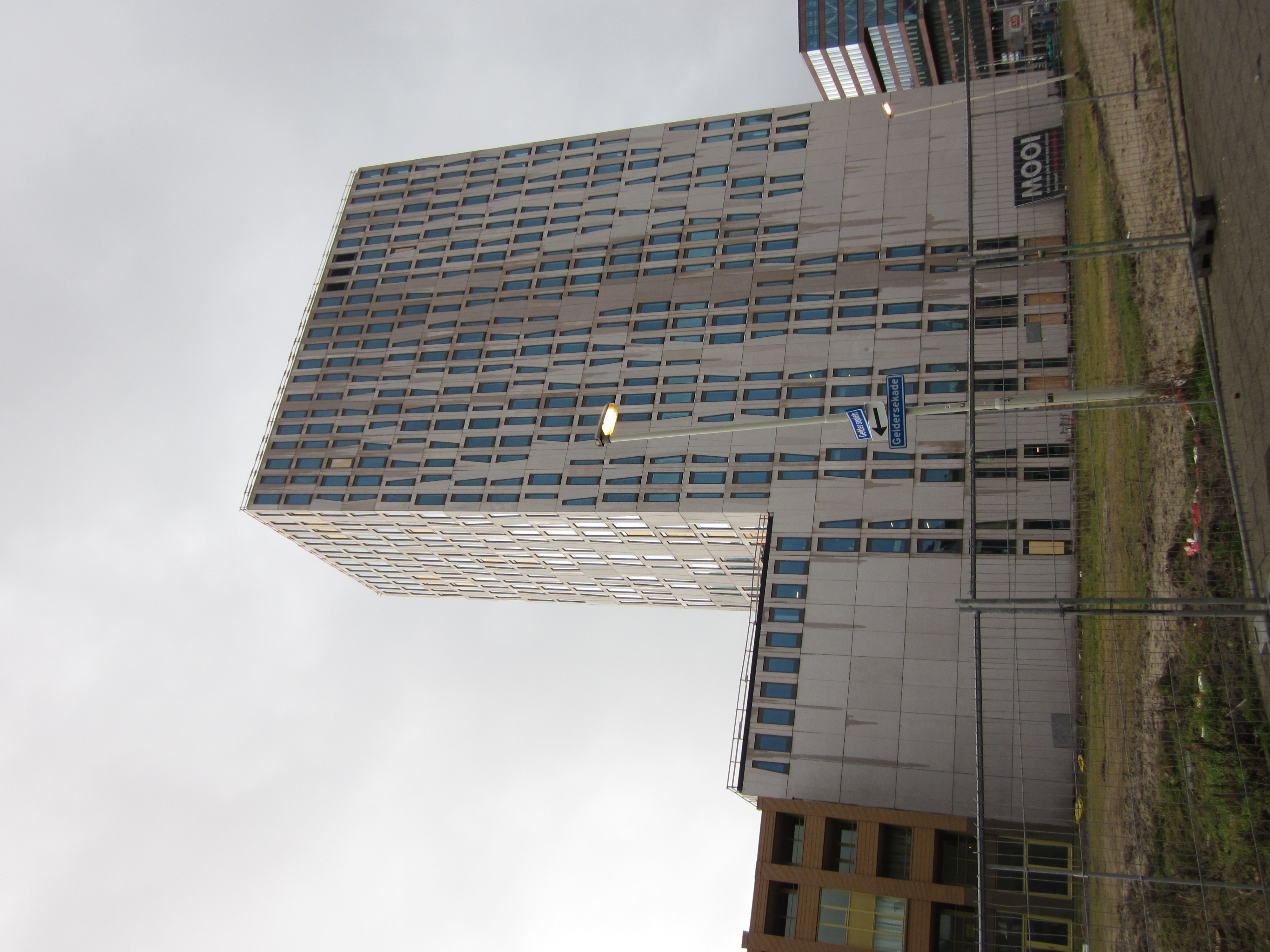 Eerder vandaag: Ik wandel over de Rotterdamse Willemsbrug langs kunstwerk “Het Maasbeeld“, ook wel genoemd “De Waslijn”. Tien minuten later sta ik voor de gevel van “Blaak 8″, een nieuw kantorencompex dat in juli 2011 wordt opgeleverd en zal worden bewoond door energieleverancier Stedin. Zonder het te weten maak ik in diezelfde tien minuten kennis met een exponent van de stroming Analytisch Kubisme en een ongebruikelijke gevelstructuur die zorgt voor prikkelende dynamiek. Het zijn niet mijn woorden. Op de site www.openbarekunst.nl lees ik dat “De Waslijn” , of zoals u dus wilt, “het Maasbeeld“, tot stand is gekomen na grondige bestudering van de omgeving door Auke de Vries (1937) , de ontwerper. Het gaat hier om een stalen ring, doos, wimpel en een hangende bal. Allemaal elementen uit de scheepvaart. Hoezo“Typisch Analytisch Kubistisch??”, zo vraag ik mij, enkele uren later, na een bezoek aan enkele horecagelegenheden, nog steeds af. Van de gevel en uitstraling van Blaak 8 raak ik vanmiddag niet enthousiast. Verre van zelfs. Het gebouw komt op mij zelfs enigszins deprimerend over.