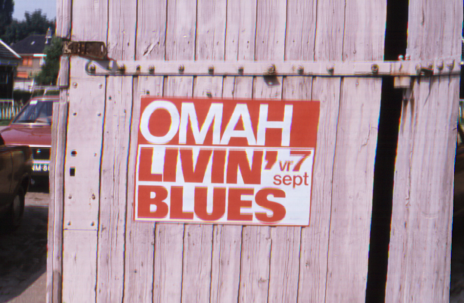 Affiche van Livin Blues 1980 of 1981 aan de gevel van het oude OMAH op het Pontonniersterrein in Papendrecht. (fotograaf onbekend)