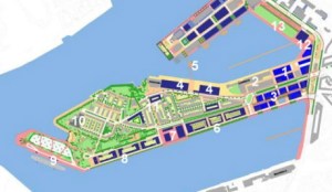 Overzichtskaart bouwprojecten Katendrecht, met op nummer 1, de locatie van het ECCR. (bron: top010.nl)