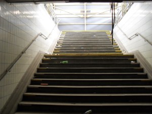 Stille getuigen op de perrontrappen van de twee jaar geleden gesloten hal van het Rotterdamse Centraal Station (foto: René Hoeflaak)