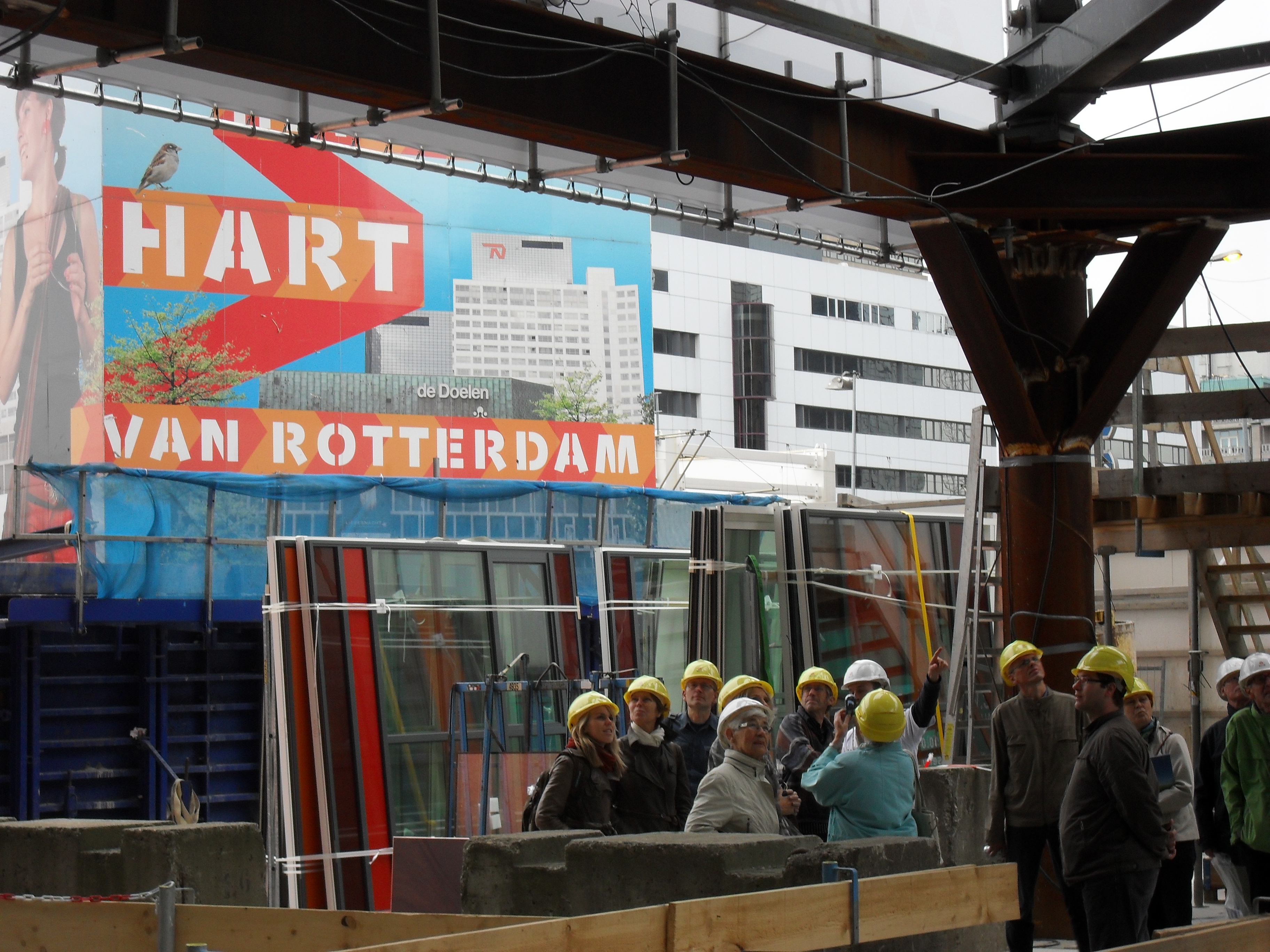 Vandaag bezocht ik twee Rotterdamse bouwprojecten tijdens de Dag van de Bouw en ben ik ingewijd in de wereld van biagonale kliklijnen, prefab liftkeringen, hellende gevels, gelaagde schuifpuien, en gevelbeplatingen. Vanaf nu kan ik op verjaardagen indruk maken met mijn kennis van wanden- en dakmethode, tunnelbekistingen en polderconstructies en weet ik het verschil tussen de eerste echte heipaal en de eerste officiële heipaal. En wat te denken van de Laag van Kedichem. Een tot vandaag mij onbekende laag van 41 meter diepte. En eindelijk weet ik nu ook hoe de zelfklimmende bouwkranen werken.