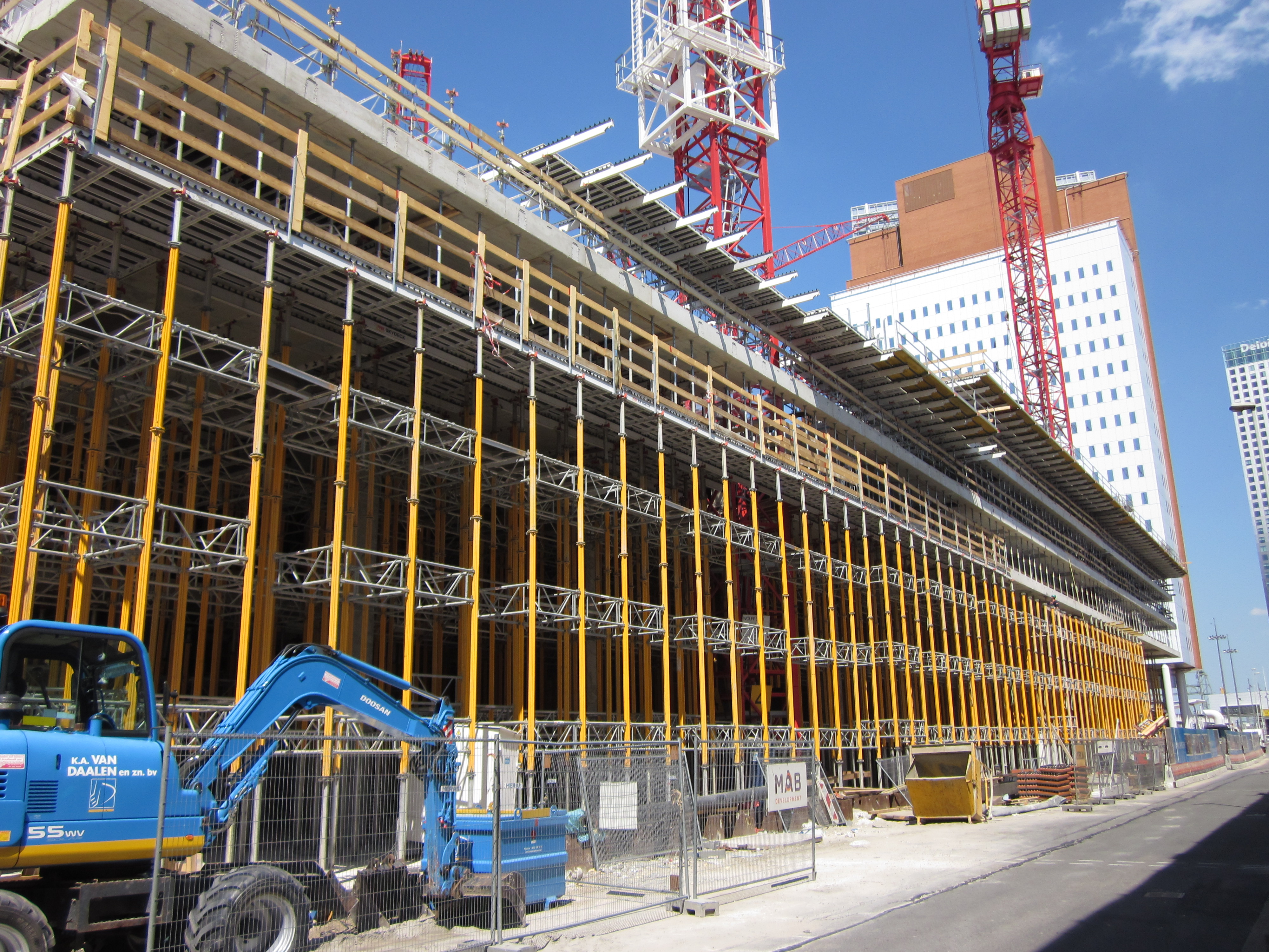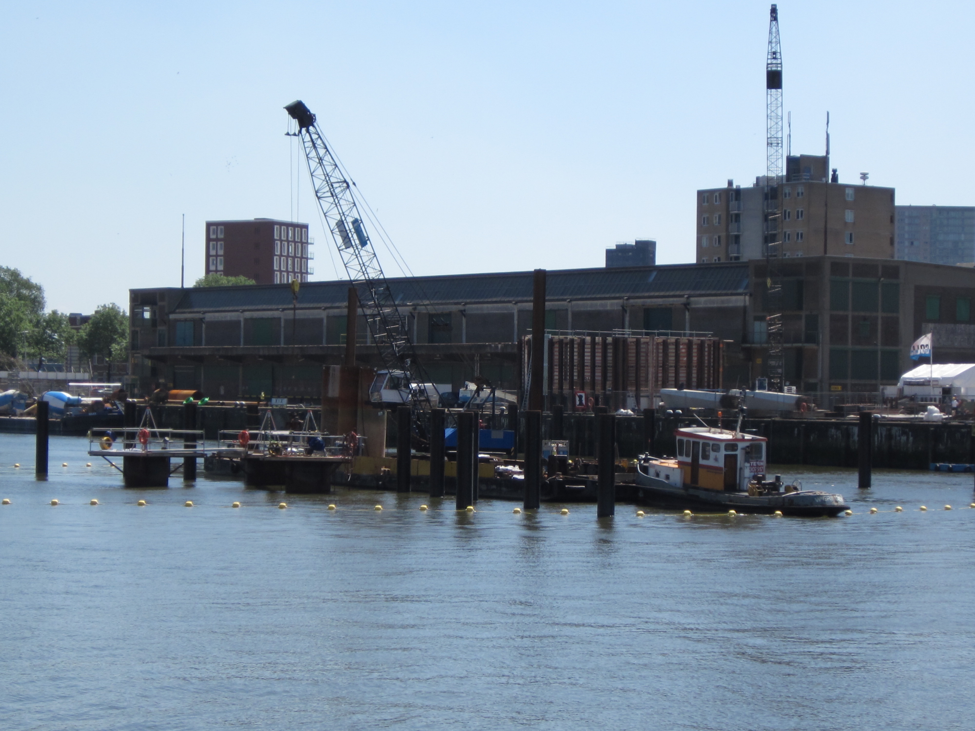 Strak blauwe hemel en 28 graden. Prima dag voor een rondje langs de velden op de Rotterdamse Wilhelminapier. De eerste paal van de Rijnhavenbrug (niet te verwarren met de officiële eerste paal, zo weet ik sind zaterdag) ging 16 februari 2011 in de grond.  We zijn nu drie maanden verder en door de cilindervormige palen in de Rijnhaven krijg ik al een aardig beeld van de vorm. Zo te zien is de bouw gestart aan de Katendrechtse oever. De Rijnhavenbrug, ontworpen door Quist Wintermans Architecten uit Rotterdam, zal nog dit jaar open gaan en verbindt de Wilhelminapier met Katendrecht. Katendrecht komt zo een stukje dichter bij het centrum. De 160 meter lange brug begint en eindigt bij Hotel New York en eindigt en begint op Katendrechtse Deliplein. Het is nog steeds onduidelijk of de brug ook toegangelijk zal zijn voor brommers of alleen voor voetgangers en fietsers. Volgens diverse berichten is de opening en sluiting (of neer- en ophalen) van de brug een sensatie. We gaan het zien. En dan “De Rotterdam” van Remco Koolhaas. De toren gaat nu echt groeistuipen krijgen. Volop bedrijvigheid tussen de vier reusachtige rode kranen, zo zie ik vanaf het terras van café Rotterdam (geen familie).