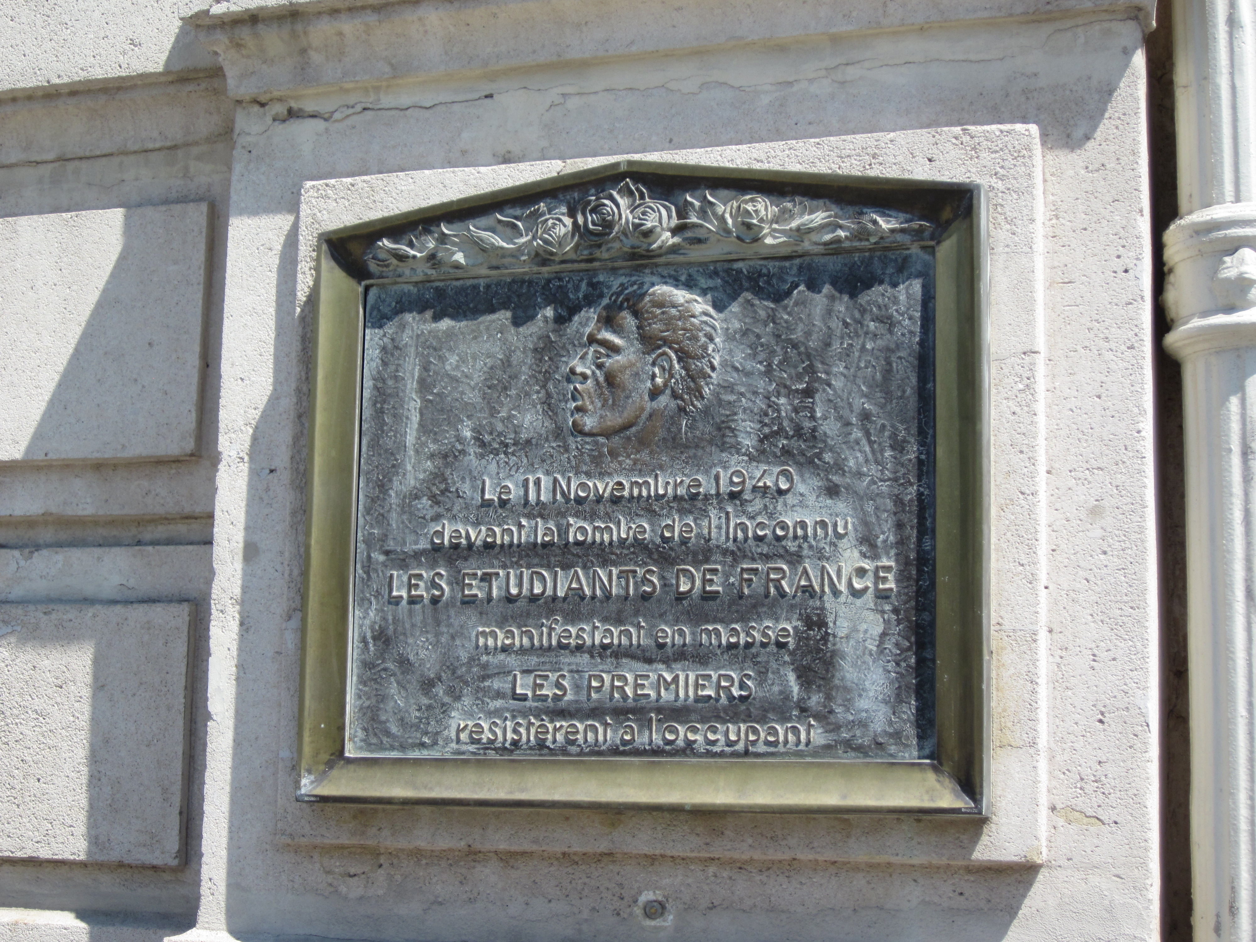 In een gevel, enkele kilometers verderop, aan het eind van Avenue Champs Elysees, herinnert een gedenksteen aan de studenten- en scholierendemonstratie van 11 november 1940. Deze demonstratie van vijfduizend studenten, exact 22 jaar na de overwinning op de Duitsers in de Eerste wereldoorlog, wordt door de Fransen nog steeds gezien als de eerste daad van verzet tegen de Duitse bezetting. Vorig jaar werd de demonstratie nog groots herdacht, in het bijzijn van President Sarkozy.