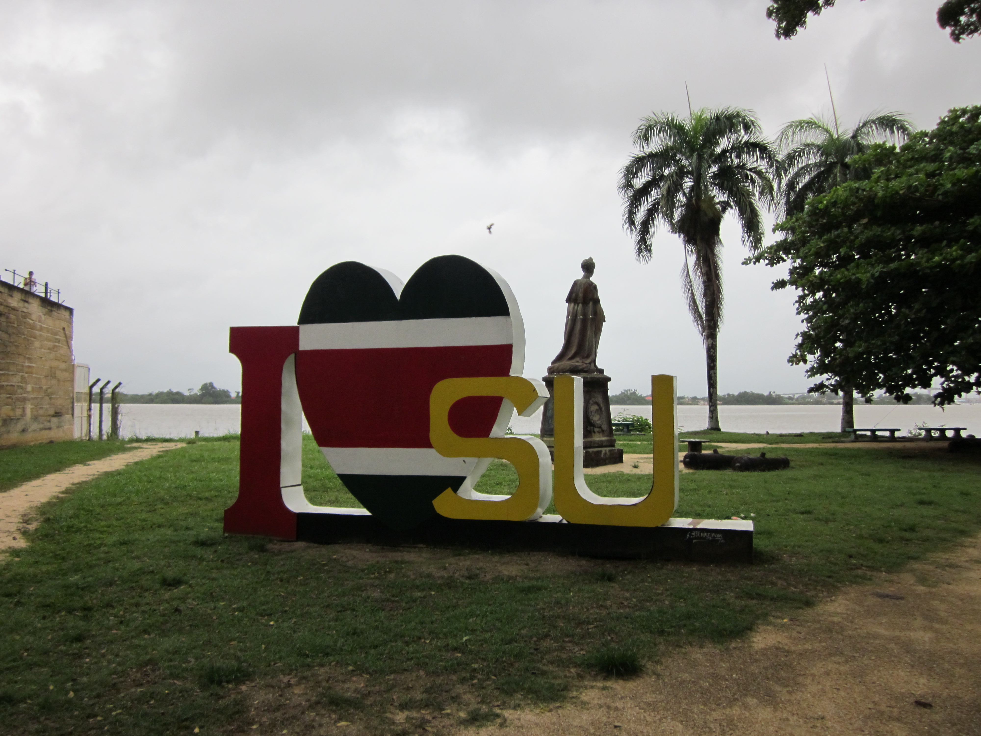 Vanaf het uitkijkpunt van Fort Zeelandia lijkt het een ludiek eerbetoon van de Surinaamse U2 fanclub. Van achteren bezien lijkt de “S” immers op een “2”. In werkelijkheid is het een liefdesverklaring aan Suriname, het “I love SU” kunstwerk op het licht modderige grasveldje tussen Fort Zeelandia en de Nationale Assemblee in Paramaribo. Vorige week werd de houten uitvoering vervangen door een betonnen versie. De houten versie bleek niet bestand tegen de Surinaamse weersomstandigheden. De onthulling van de betonnen liefdesverklaring werd bijgewoond door diverse vertegenwoordigers uit de Surinaamse Culturele wereld. Zelfs de Nederlandse ambassade was vertegenwoordigd. Het Sredifenci (onafhankelijkheids)monument is gemaakt door kunstenaar George Struikelblok die erg blij is met de aandacht die zowel het houten als het betonnen exemplaar de afgelopen maanden ten deel is gevallen.