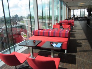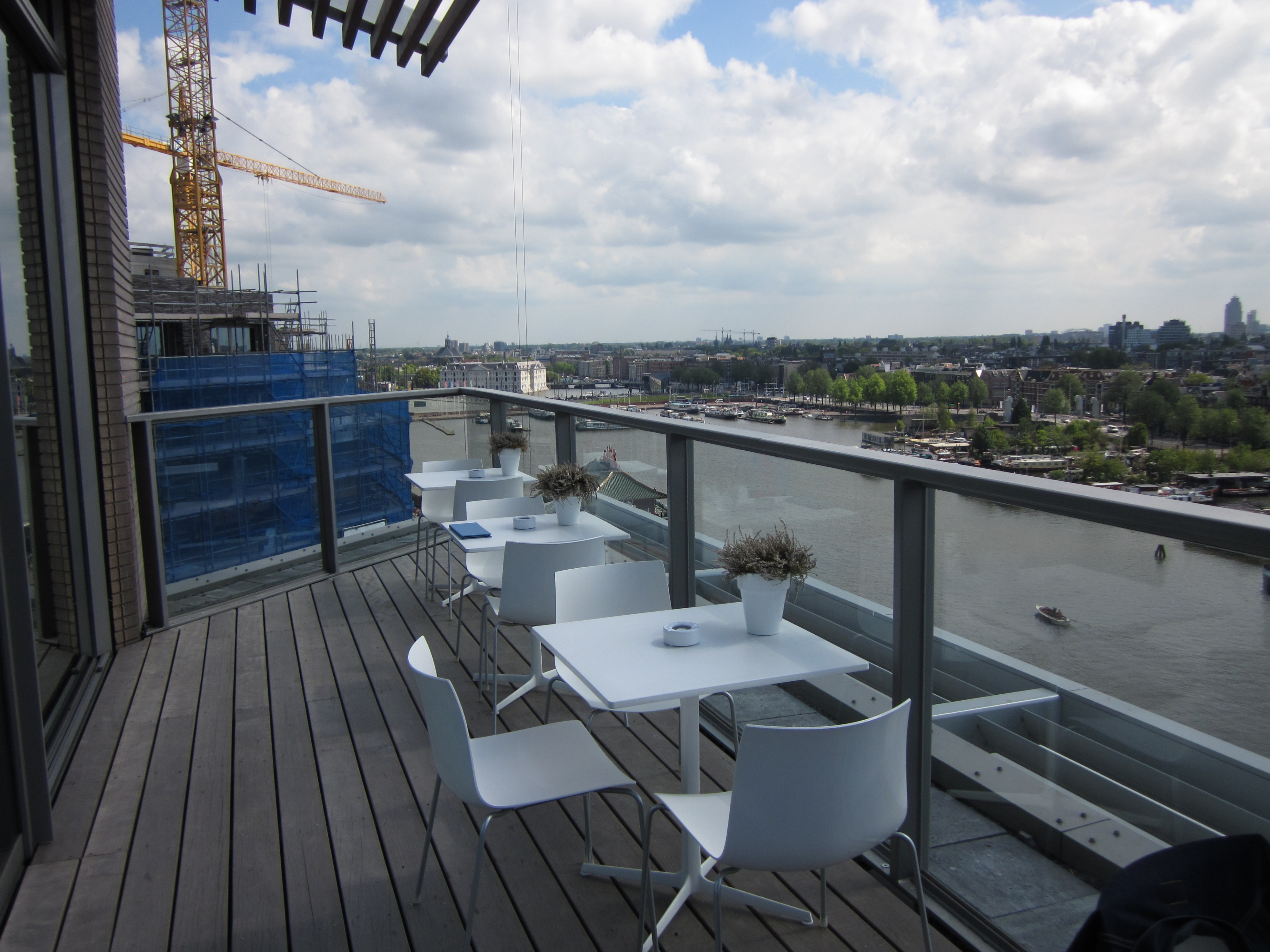 Het terras van de Schreierstoren; Zeker niet het minste terras van Amsterdam. Toch lonken vanuit de hemel de witte terasstoelen van de Skylounge. En zo stappen wij een half uur later uit de lift op de elfde etage van het fonkelnieuwe Minthotel aan de Oosterdokskade en bestellen we in de SkyLounge twee Japanse Kirin Ichiban biertjes. We begeven ons op niveau nietwaar!!. De rollen zijn in enkele minuten omgedraaid. Want vanachter de beglazing van het terras van de Skylounge kijken wij nu uit maar zeker niet neer op het terras van de Schreierstoren. Na de sloop van het voormalige postkantoor op het Oosterdokeiland en het daarmee ter ziele gaan van Club 11 is de Skylounge de nieuwste Amsterdamse Hotspot op hoogte in spé. Het Minthotel is nog geen twee maanden geleden geopend en is met 553 kamers één van de grootste hotels van de hoofdstad. “Wij zijn de grootste”aldus de kelner van de Skylounge. Het Minthotel is de eerste uit de “Mint”keten buiten het Verenigd Koninkrijk.