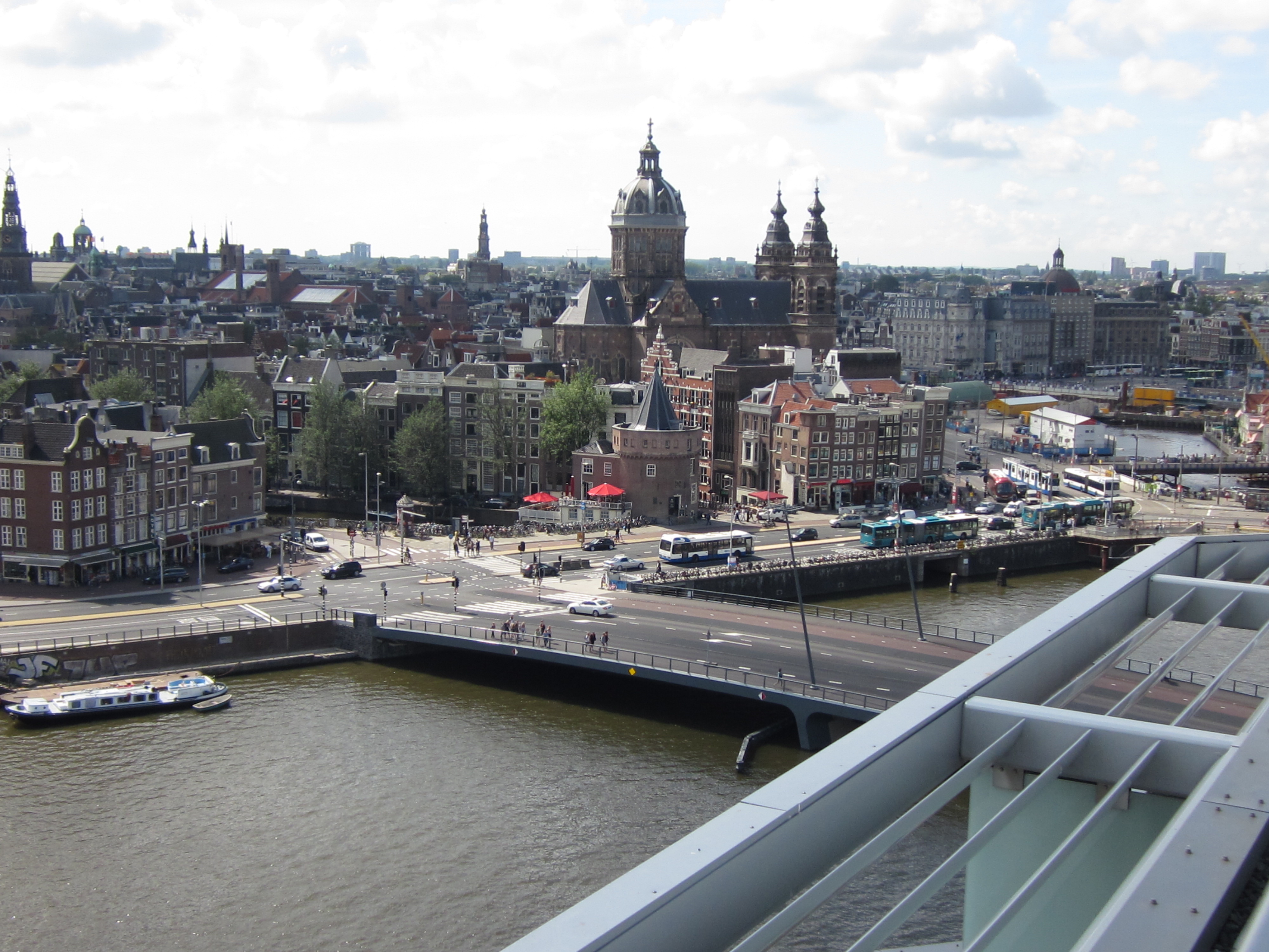 Amsterdam; Uitzicht op de Schreierstoren en de Nicolaaskerk vanaf het terras van de SkyLounge (foto: René Hoeflaak)