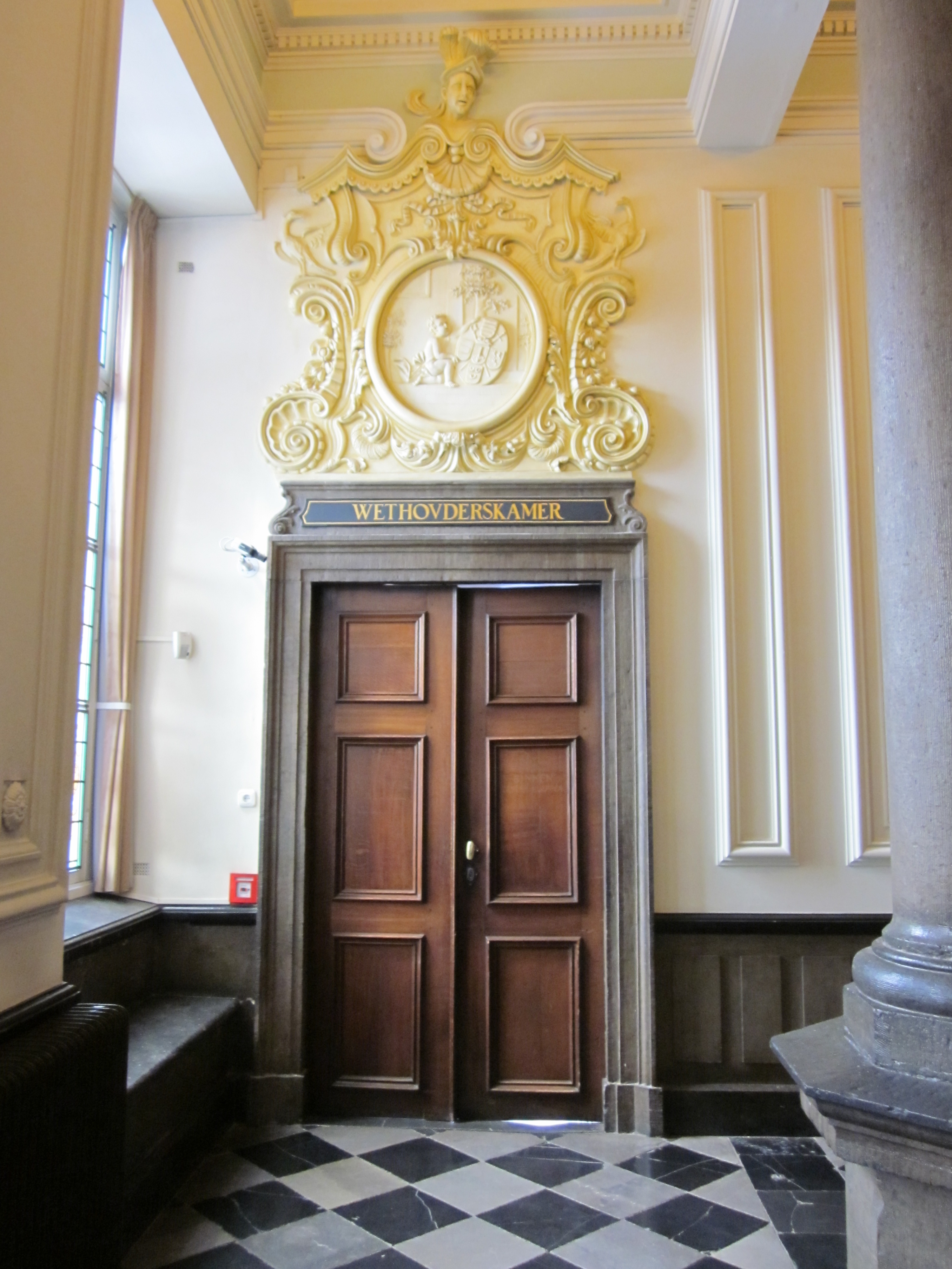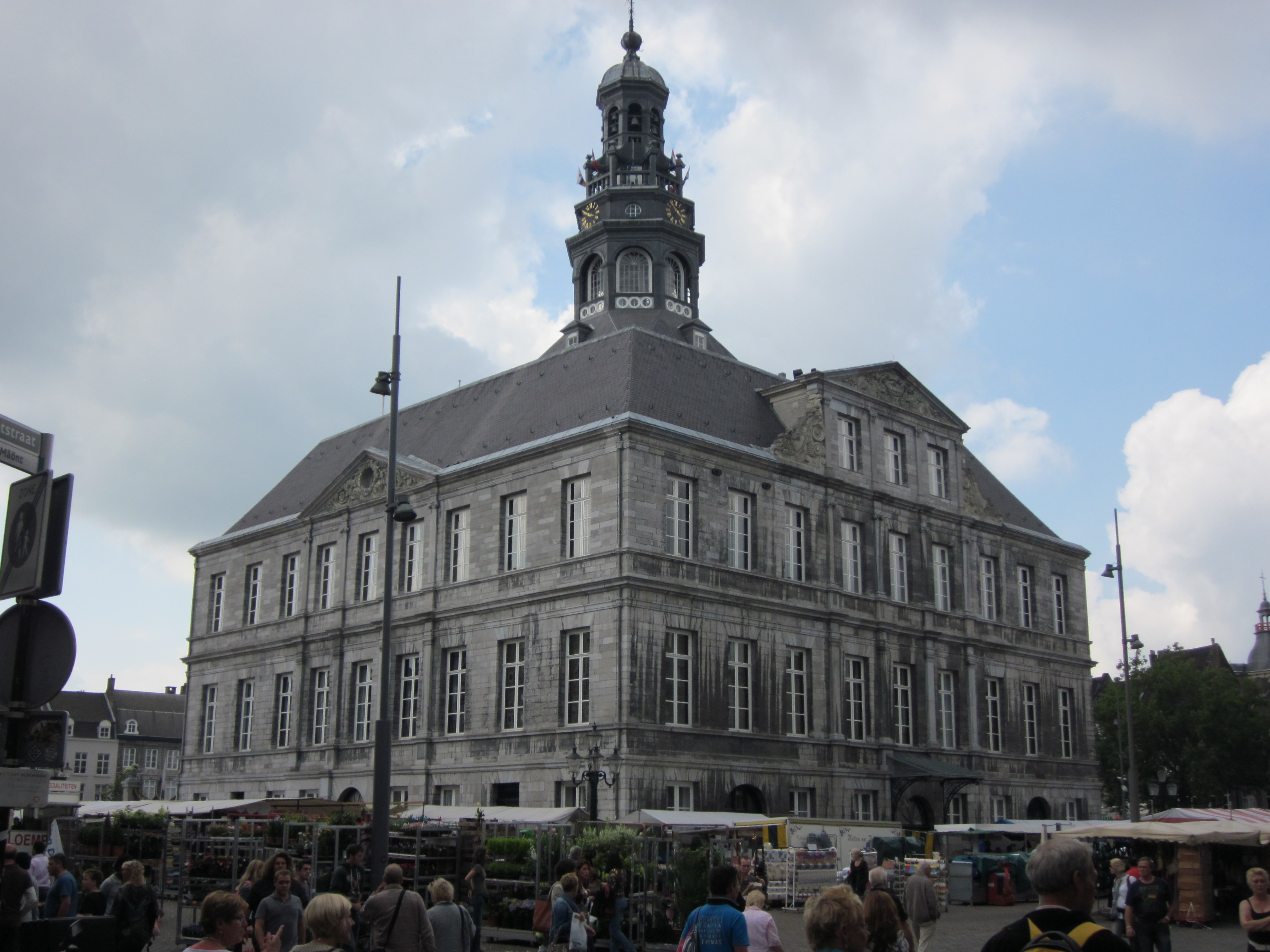 Het stadhuis uit 1662 is een ontwerp van Pieter Post, hofarchitect van stadhouder van Frederik Hendrik. Pieter Post woonde en werkte eerder als schilder in Rome waar hij werd beinvloed door de Italiaanse bouwstijl. Bij terugkeer in Nederland werd Pieter Post één van de belangijkste bouwmeesters van het land. Het stadhuis in Maastricht kent een Brabantse en Luikse zijde. Dit om de beide heren van Maastricht, de Hertog van Brabant en de Bisschop van Luik, tevreden te stellen. Het poldermodel zat er dus al goed in, bij Pieter. Het stadhuis staat niet, zoals oorspronkelijk de bedoeling, midden op de Markt. Een Luikse huisjesmelker wilde niet wijken en liet zich niet onteigenen. De burgemeesterskamer is nog steeds intact. Wethouders-, griffie-, en raadkamers wisselden van Luikse naar Brabantse kant of andersom. Ik ben er (nog) niet achter hoe het nu precies zit met die kamers. Huiswerk voor een volgend bezoek aan Maastricht.