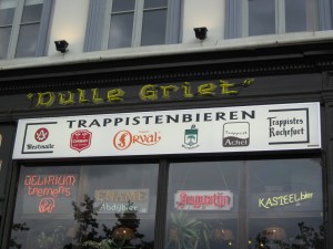 “De Dulle Griet” en “De groten rooden duyvele” zijn de twee bijnamen van het grote rode kanon aan het Groot Kanonsplein in Gent. Er is slechts één kogel mee afgevuurd. Toch is het één van de bekendste kanonnen van de lage landen en daamee ook een trekpleister in Gent. Het kanon werd in de 16e eeuw versleept naar Gent als verdedigingswapen tegen de Spanjaarden. De bijnaam Dulle Griet is afgeleid van het Duitse “Holle Gerat:, Hels geschut”. Wie Dulle Griet en 249 ander (trappisten)biersoorten wil proeven moet een eindje verderop naar herberg De Dulle Griet op de Vrijdagmarkt. Op het terras van de herberg probeer ik een Dulle Griet. Licht van smaak en kleur.