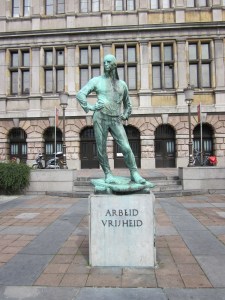 De afgelopen jaren berichtte ik regelmatig over en vanuit Antwerpen. Pas gisteren maakte ik aan de Suikerrui voor het eerst kennis met de Buideldrager. Het was vooral de tekst “Arbeid Vrijheid” die mijn aandacht trok. De Buideldrager is het vrijheidsbeeld van Antwerpen.