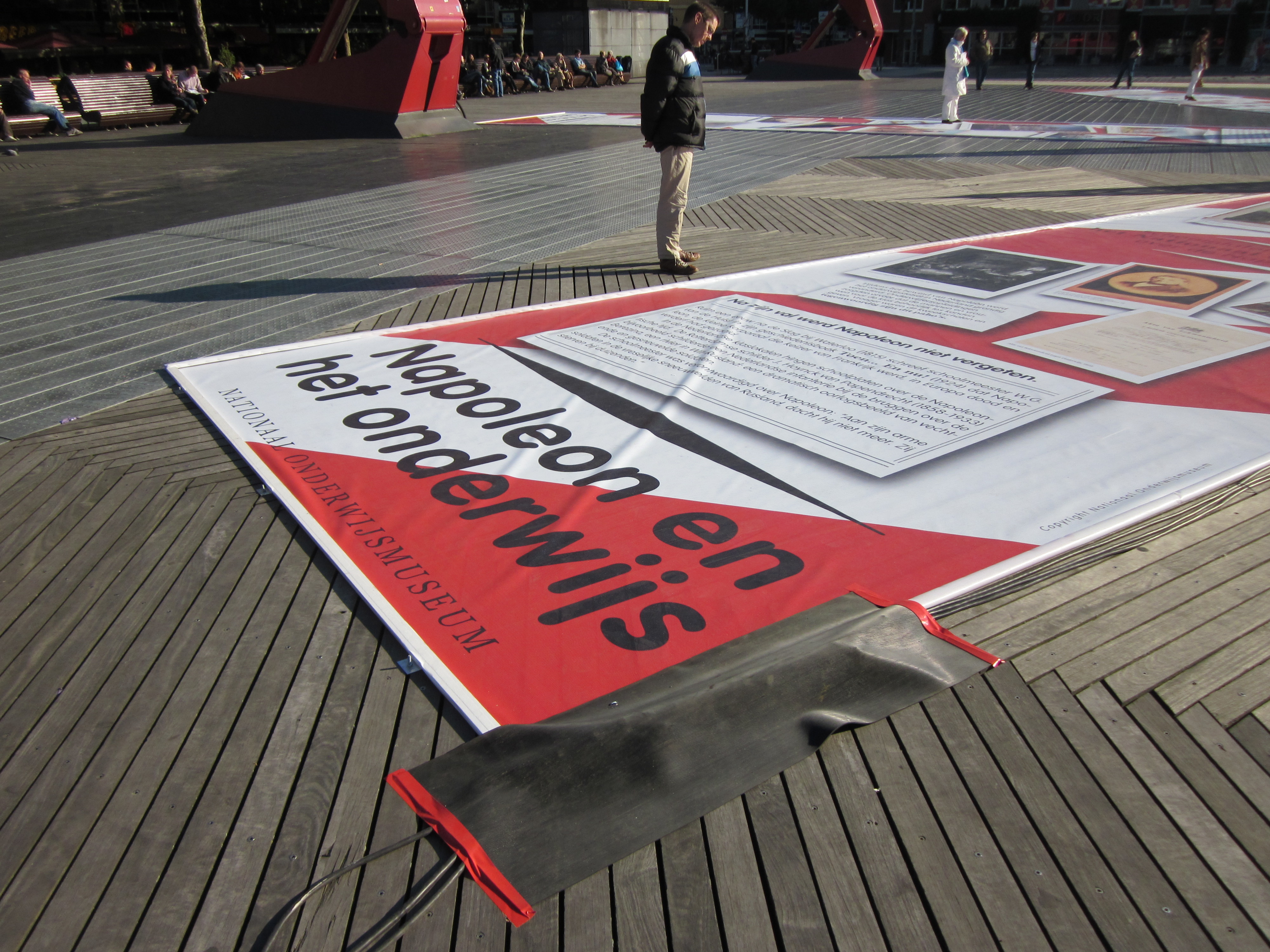 Deze maand is de maand van de geschiedenis. Rotterdam blikt daarom terug op het bezoek van Napoleon. Een bezoek dat plaatsvond in de stromende regen. Zondag bezocht ik onder een wolkenloze en strak blauwe hemel het Schouwburgplein, tijdelijk omgedoopt tot Tijdplein . Midden op het plein leiden zes rood/witte lopers naar zes hoge pionnen. Iedere loper belicht het leven van Napoleon, zijn invloed op Nederland en zijn bezoek aan Rotterdam vanuit een andere invalshoek. Op de lopers zijn onder meer prenten te zien van de koperen stadsleutels die burgemeester Suermondt overhandigde aan Napoleon bij de Delftsche Poort. Ook is te lezen en te zien dat niet iedereen even blij was met de komst van de omstreden Napoleon. Door Napoleons invoering van de dienstplicht werden veel Rotterdamse jongens opgeroepen voor de strijd aan het front in Rusland. Veel van hen keerden helaas niet meer terug. Opkomst voor dienstplicht was aanvankelijk – tot 1898- een kwestie van loting onder mannen ouder dan twintig jaar, zo is te lezen op het plein. Want ook over de invoering van de Burgerlijke stand en dienstplicht is een loper uitgelegd.