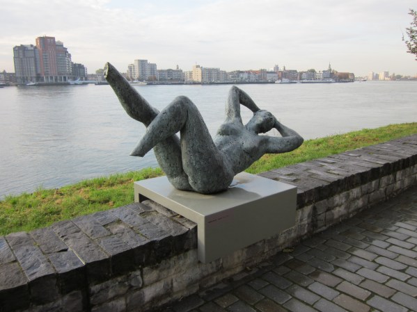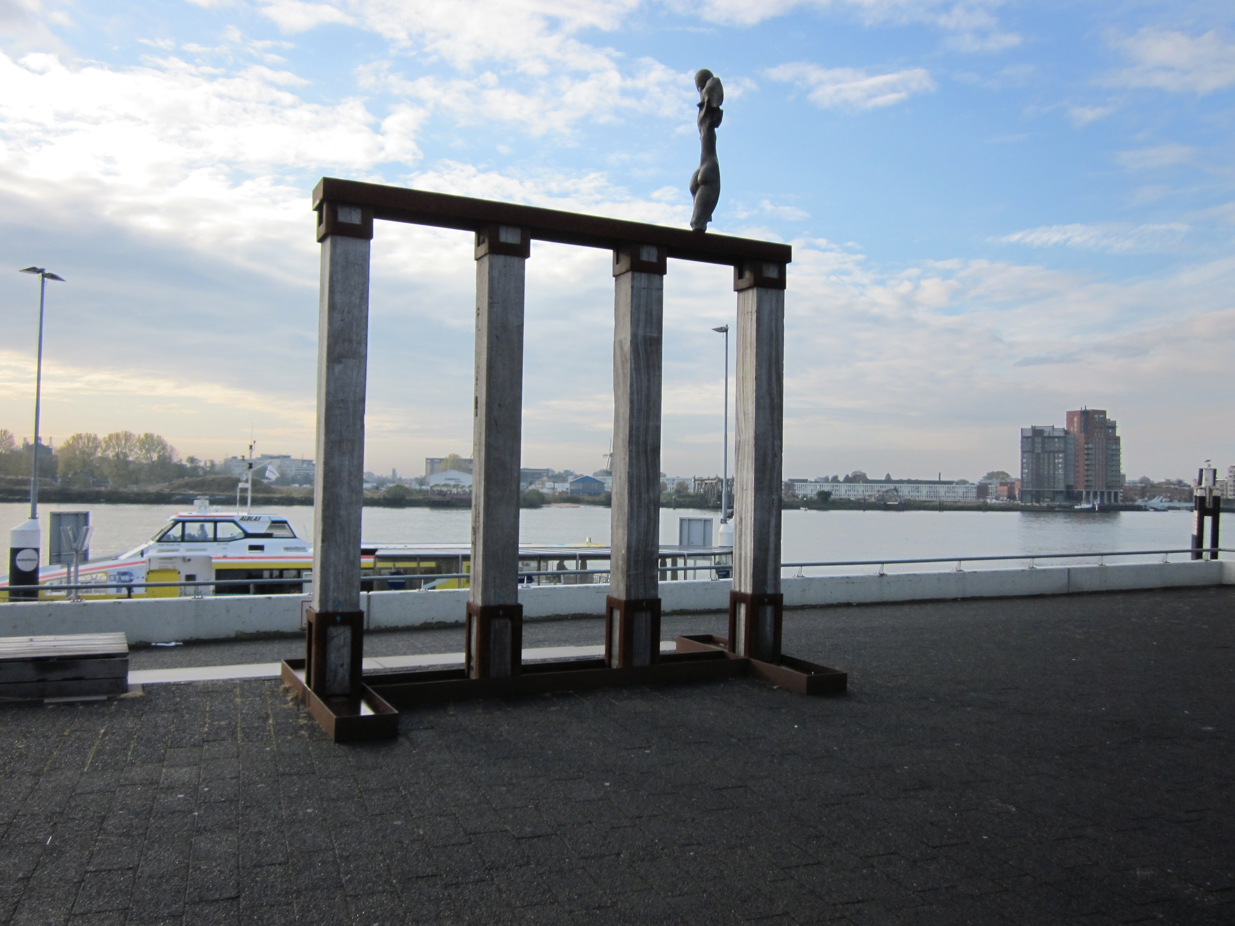 Op de consumerende “ochtend” toerist is Grand Café Willaerts op het Havenhoofd nog niet in- en opengesteld. Niet getreurd. Want mijn toeristische antenne slaat pas echt aan als ik een Romeinse tempelgevel meen te ontdekken. Een Romeinse tempel aan de Merwede?? Tijden veranderen in Papendrecht. De tempelgevel is het begin van een serie beelden en objecten uit de tentoonstelling Riverside . Een serie met een hoog Kopenhaags zeemeermin gehalte. Ik passeer “Schelpen” van Marja van Hal en de “Kupfernickel”, een marsmannetje achtig mensbeeld van Nick Renshaw. “Waarom stoppen toeristenbussen wel bij een kleine zeemeermin en niet bij de Papendrechtse Volupté“, zo vraag ik mij af, uitkijkend over de Skyline van Dordrecht en Zwijndrecht.