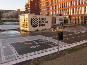 Allereerst de beste wensen voor 2012. We beginnen het jaar met economisch nieuws. Of is het cultureel nieuws? Al enige tijd trekt namelijk een container op het Mahlerplein in Amsterdam Zuid mijn aandacht. Niet in de laatste plaats door de tekst “Kunst Reserve Bank“. De container staat midden in de Zuidas, het financiële centrum van Amsterdam. Na wat googelen ben ik een stuk wijzer. De Kunst Reserve Bank is een initiatief van een aantal kunstenaars en gaat een eigen munt uitgeven. Een reservemunt. De bank gaat – als alles goed gaat- op 1 maart open. Maar daarover later meer.. De bedoeling is dus dat de Kunst Reserve Bank een nieuwe munt gaat uitgeven als alternatief voor de Euro en het huidige monetaire systeem, zo lees ik op de site van de bank in oprichting. De koers van de munt is gebaseerd op de waarde van het onderliggende kunstwerk. Iedere week wordt door een kunstenaar een kunstwerk als munt in honderdvoud uitgegegeven. Na vijf jaar, als 25 duizend munten door 60 kunstenaars zijn uitgegeven, stopt de bank haar activiteiten. Prominenten als Herman Wijffels, Drs. Heertje en Rick van der Ploeg worden opgevoerd in het comité van aanbeveling.