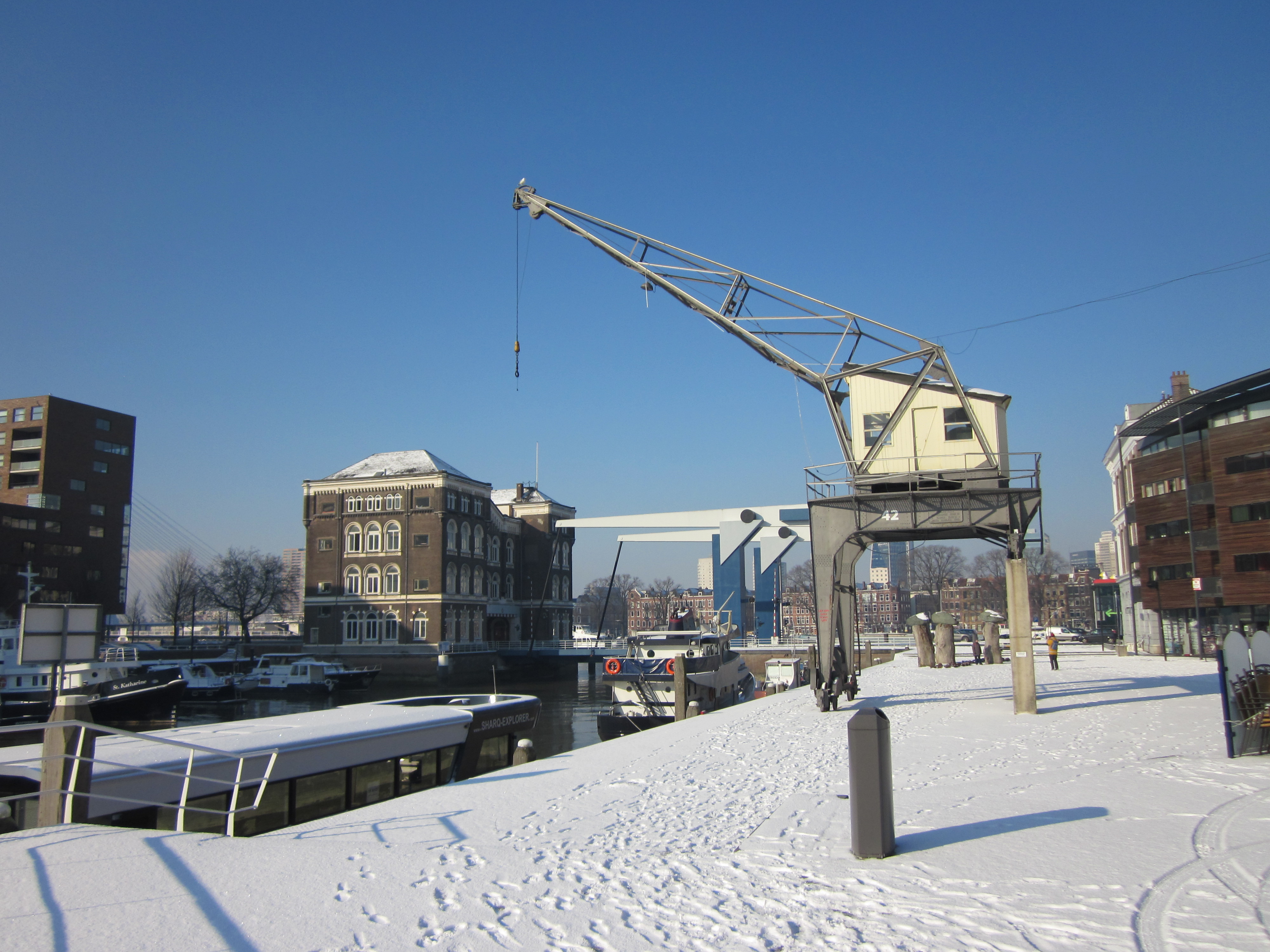 Onder een strakblauwe hemel en een temperatuur van tien graden onder nul druk ik zaterdag mijn voetstappen af in de sneeuw langs de Entrepothaven en onder het Poortgebouw in Rotterdam. Uiteraard kan ook ik de verleiding niet weerstaan om een foto te maken van dit besneeuwde stukje fraai Rotterdam.