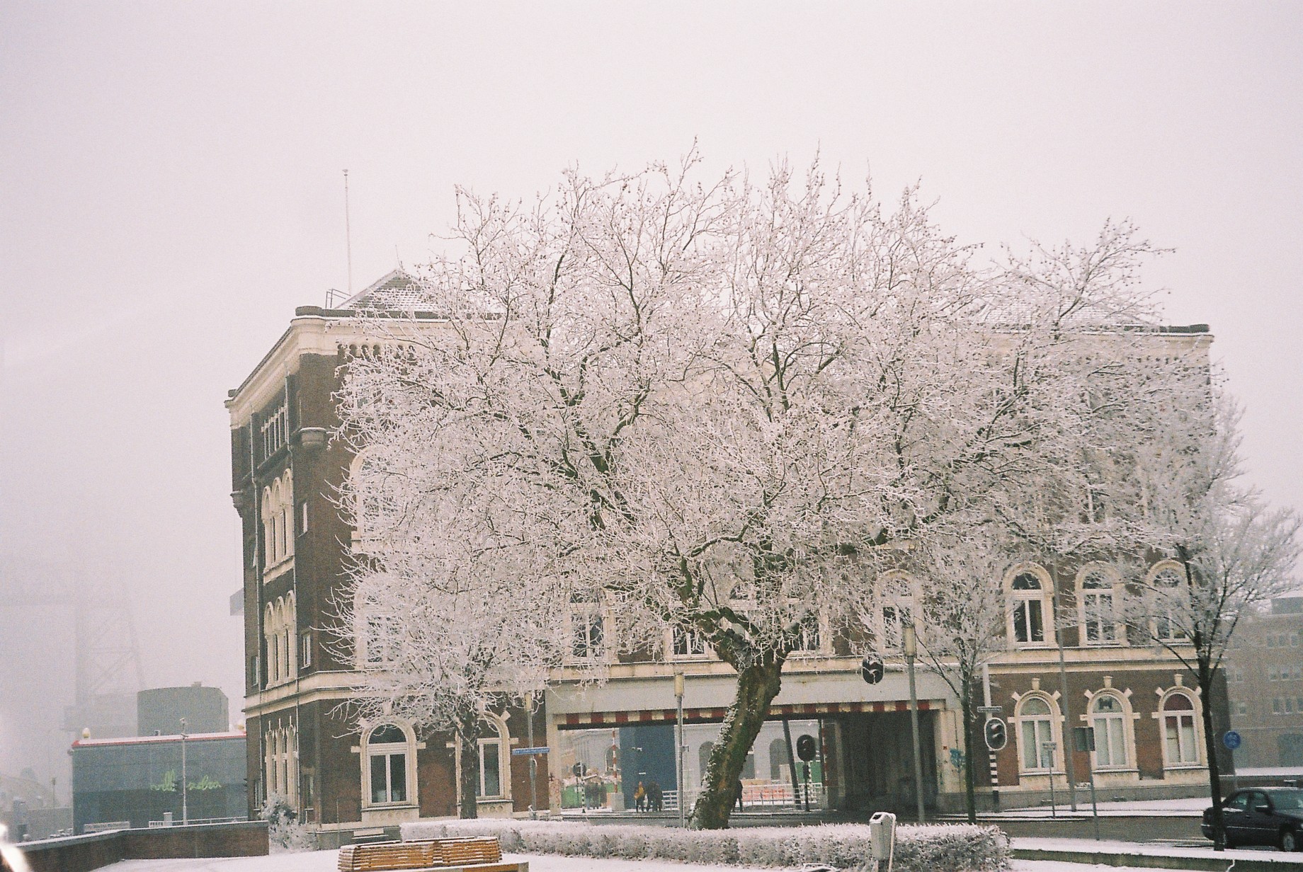 Ik moet denken aan een decemberdag in 2007. Mist en vorst veranderden Nederland in een uniek sprookjesbos. Ruige rijp?? En ook toen kwam ik thuis met een foto van het het Poortgebouw. Het gebouw uit 1878 heeft een rijke historie met warme zomers en koude winters. Zo was het in de strenge winter van 1963 het kantoor van het Gemeentelijk Havenbedrijf. Over de winters en zomers van 1880 tot 1900 kan ik weinig terugvinden. In die jaren was het Poortgebouw hoofdkantoor van de Holland-Amerikalijn. De Rotterdamsche Handelschvereeniging (RHV) onder leiding van Lodewijk Pincoffs gaf oorspronkelijk opdracht tot de bouw van het Poortgebouw. In 1979, tijdens één van de strengste winters van de eeuw, overwoog de gemeente Rotterdam om in het gebouw aan de Stieltjesstraat een “eroscentrum” te vestigen. Krakers voorkwamen op 3 oktober 1980 -gemiddelde temperatuur die dag in Rotterdam 11,2 graden, geen neerslag en 8,9 uur zonneschijn- dat de gemeente haar plannen voortzette. Vanaf 1982 is van kraak geen sprake meer en is er sprake van een huurovereenkomst tussen de bewoners en de gemeente Rotterdam. Toch verkocht Rotterdam het Poortgebouw in 2005 aan projectontwikkelaar De Groene Groep (DGG). Na een periode van vijf jaar aan dreigende uitzettingen en rechtzaken tussen DGG en de huurders gebood de rechter op 30 maart 2010 de huurovereenkomst tussen de gemeente en de dertig bewoners te respecteren. De bewoners, vooral kunstenaars uit binnen- en buitenland, organiseren regelmatig optredens en er is een wekelijks – biologisch- eetcafé op zondagavond. De weggeefwinkel is tijdelijk gesloten, zo lees ik op de site. Wie in aanmerking wil komen voor de huur van één van de twee vrij te komen kamers (€ 275,00 p.m.) doorloopt een serieuze selectieprocedure. “Handyman Skills are welcome” zo vermeldt de oproep. De rechtzaken en onduidelijkheid over de bestemming hebben de staat van onderhoud van het Rijksmonument helaas geen goed gedaan. Een Handyman is meer dan wenselijk. Of het nu sneeuwt, rijpt, regent of waait.