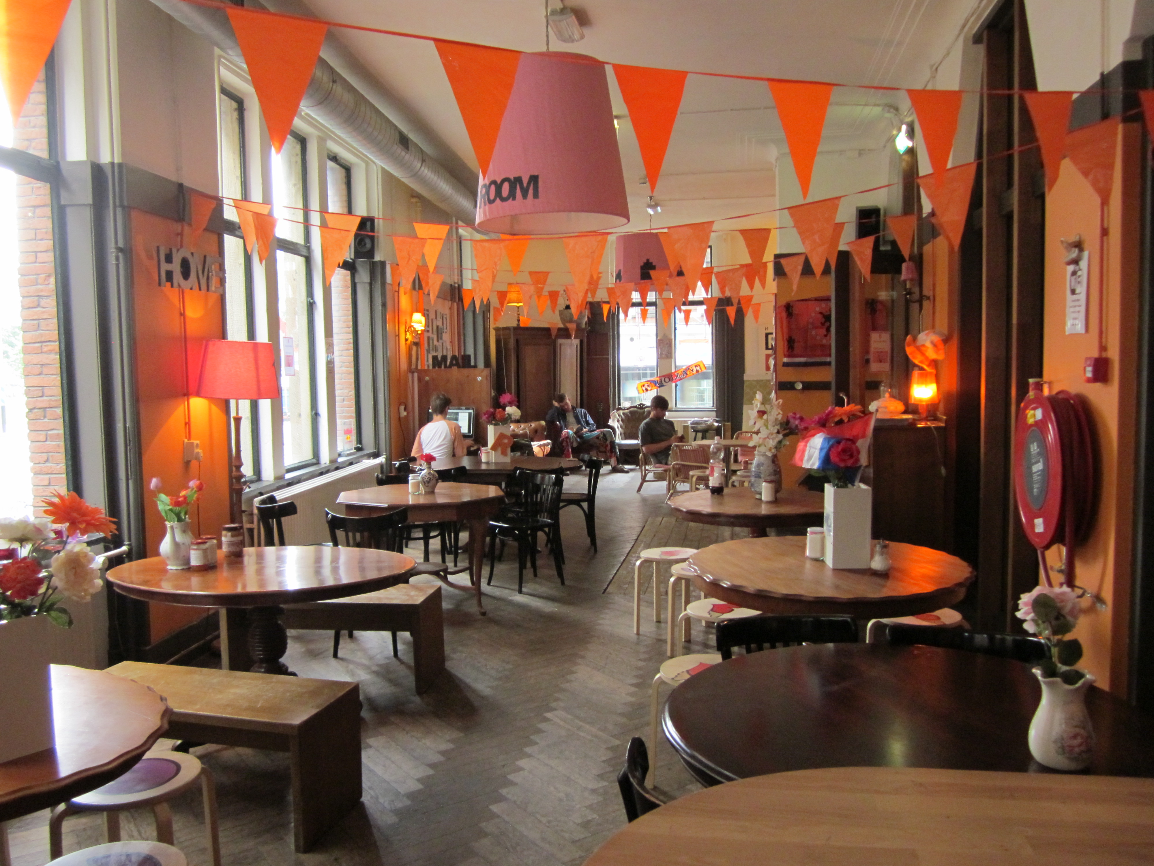 Als ik ROOM op het afgesproken tijdstip binnenkom, voel ik mij niet alleen thuis maar ook een toerist op vakantie. Reizigers checken in en uit, kaartende Amerikanen aan tafel, een Thaise toeriste eet een broodje en een Japanner zit achter een PC. Ik krijg dan ook de neiging om een plattegrond van Rotterdam uit één van de wandrekken te pakken. Monique en Mirjam wisselen elkaar als een hecht team af achter de receptie. Net als bij mij aan tafel. Terwijl Monique druk bezig is met het helpen van gasten, schuift Mirjam als eerste aan.