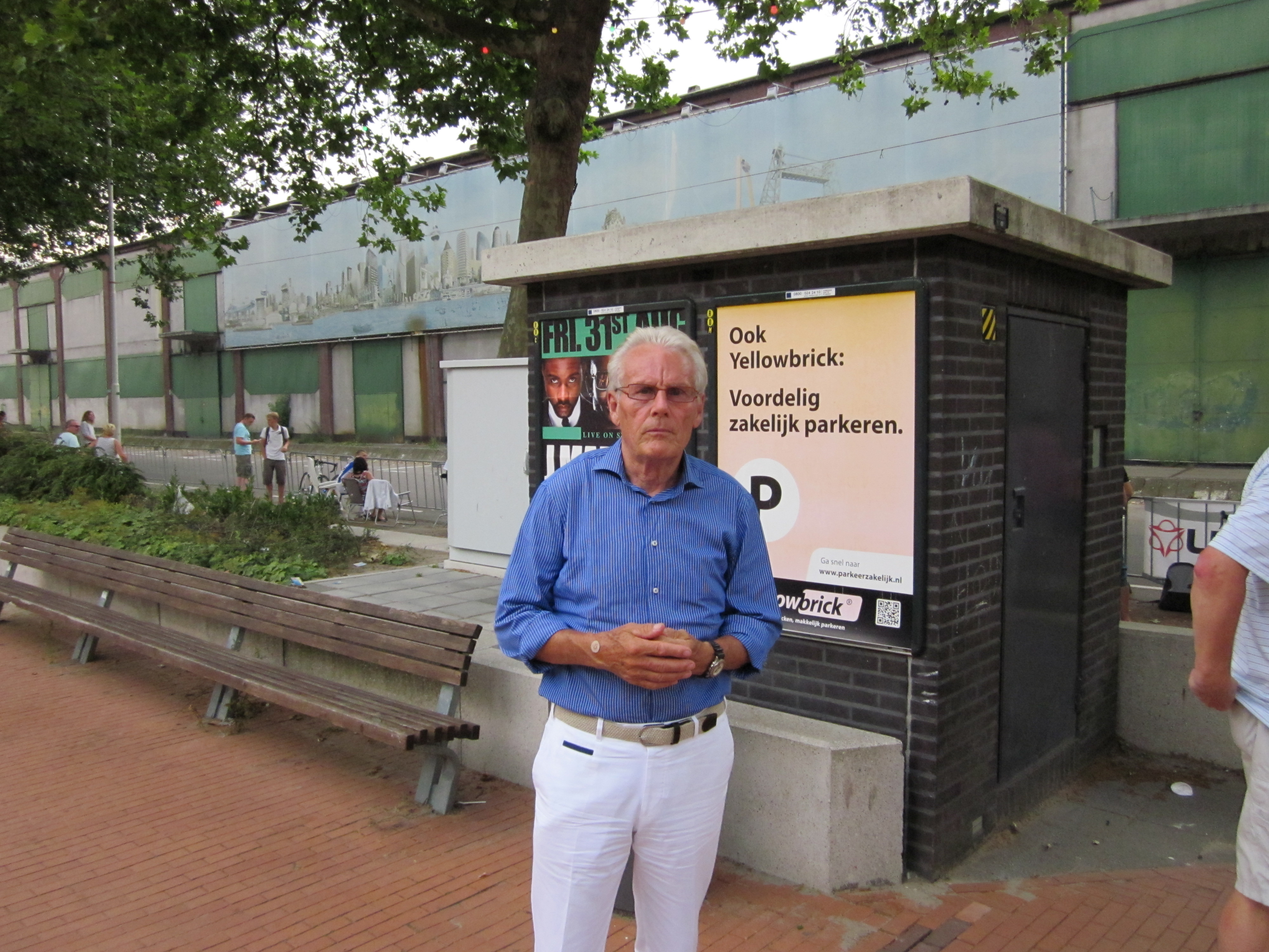 Rotterdam, Jan Janssen op het Deliplein. De winnaar van de Tour de France in 1969, verrrichtte vanmiddag het startschot bij de Ronde van Katendrecht (foto: René Hoeflaak)