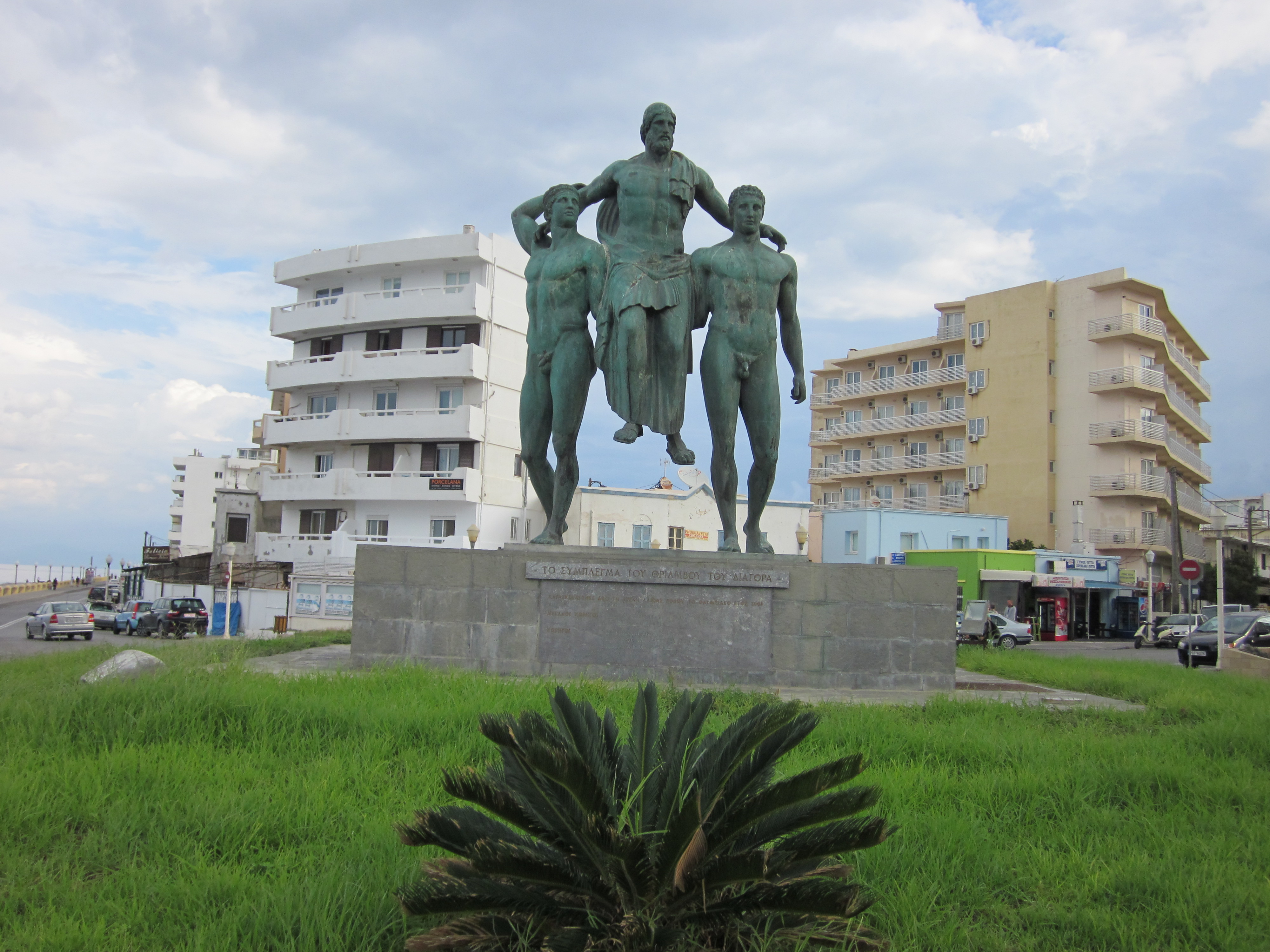 Het plein aan de noordwestkust van Rhodos is één van de bekendste rotondes van de stad. Een rotonde is het eigenlijk niet echt. Want de derde afslag is eigenlijk rechtdoor. Opletten dus. Helemaal na 2004. Want ter gelegenheid van de Olympische Spelen in Athene plaatste het gemeentebestuur van Rhodos Stad midden op het rotondeplein een standbeeld van sportheld Diagoras en zijn twee zonen. De onthulling vond plaats op 12 juni 2004. Eerder was het vliegveld van Rhodos al naar Diagoras vernoemd. Zoals het vliegveld van Liverpool naar John Lennon en die van New York naar John F. Kennedy.
