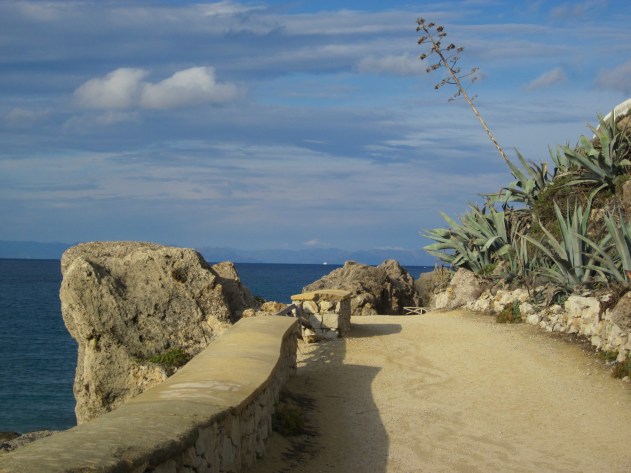 Rhodos, Griekenland, oktober 2012: Geinspireerd door de sportieve daden van de Griekse sporthelden, begin ik bij de rotonde aan een fraaie wandeling langs en onder de rotsen tussen de boulevard en het strand. Een aan te bevelen bezigheid. (foto: René Hoeflaak)
