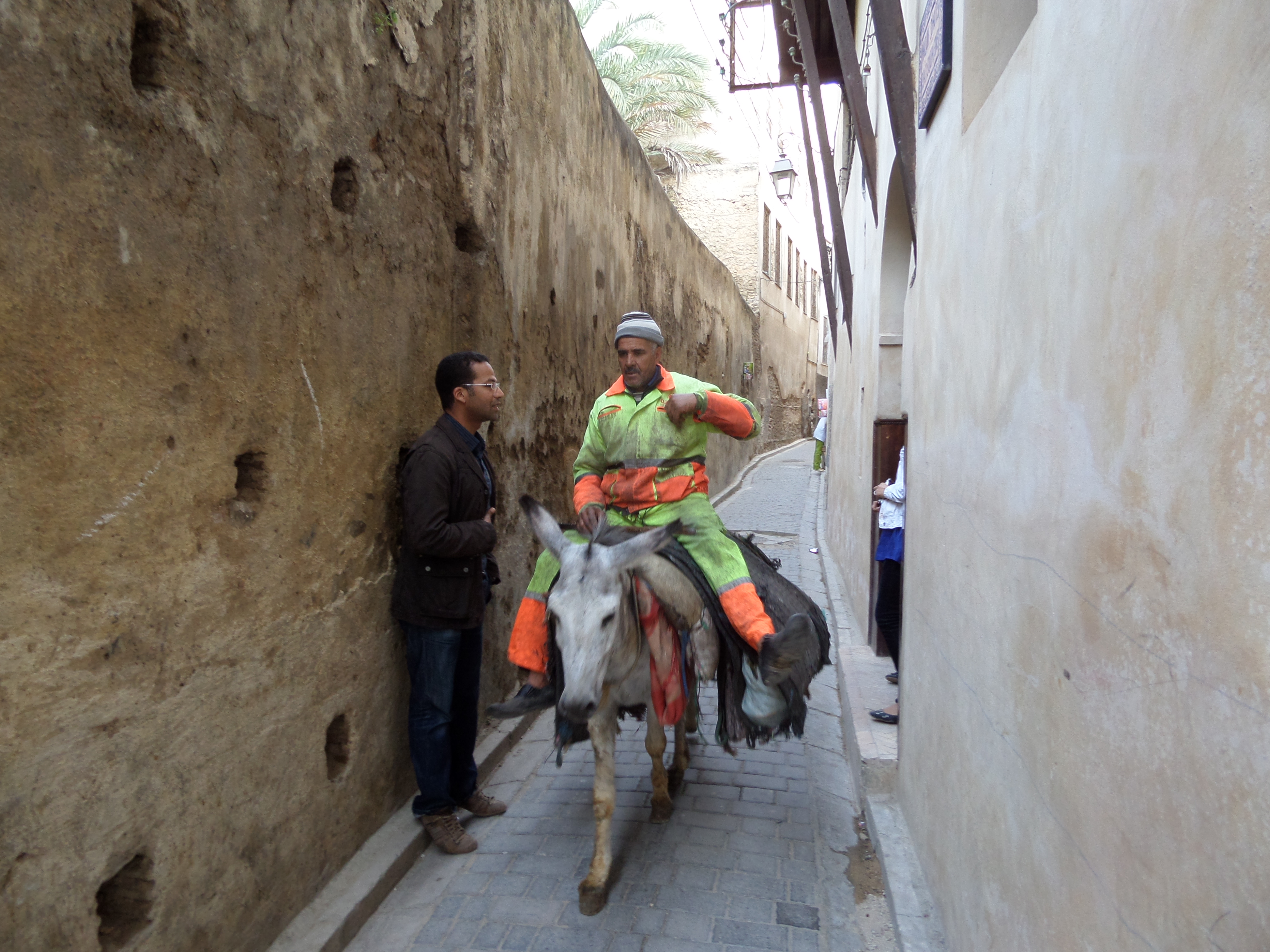 Zonder mijn fantasie op de proef te stellen wandelen we urenlang door de Middeleeuwen. We maken er zelfs deel van uit. De tijd lijkt honderden jaren te hebben stilgestaan in de nauwe en smalle steegjes van de duizend jaar oude Medina van Fes. Een middeleeuws doolhof. Het heeft iets waardigs. De ezel is het meest gangbare vervoermiddel in de Medina. De steegjes en straatjes zijn eenvoudigweg te smal voor een auto. Wie bijvoorbeeld met spoed naar het ziekenhuis moet, wordt opgehaald en vervoerd met een ezel om vervolgens buiten de Medina over te stappen op een ambulance.