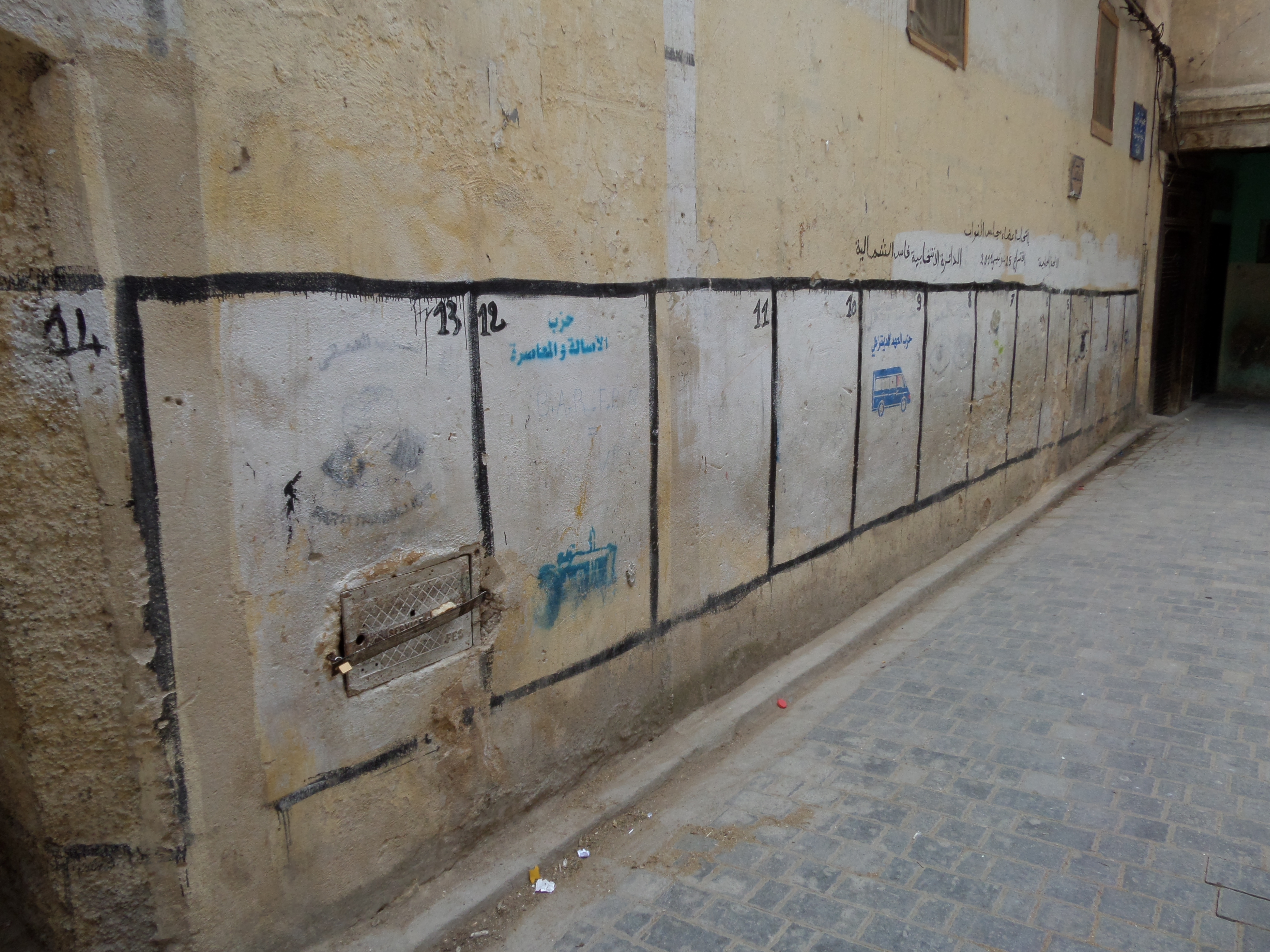 Mei 2013: Voor de verkiezingen van 2011 beschilderde vakken van politieke partijen op een straatmuur in de Medina van Fes. Ieder vak en partij heeft haar – voor analfabeten- herkenbare eigen teken. (foto: René Hoeflaak)