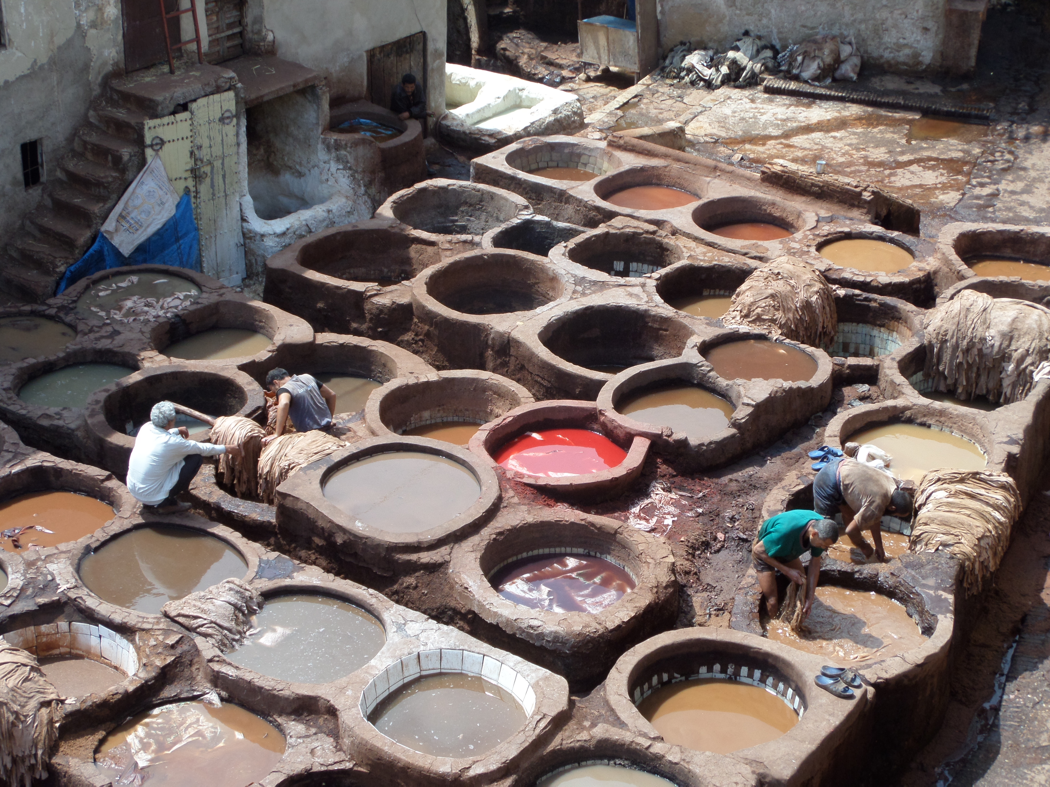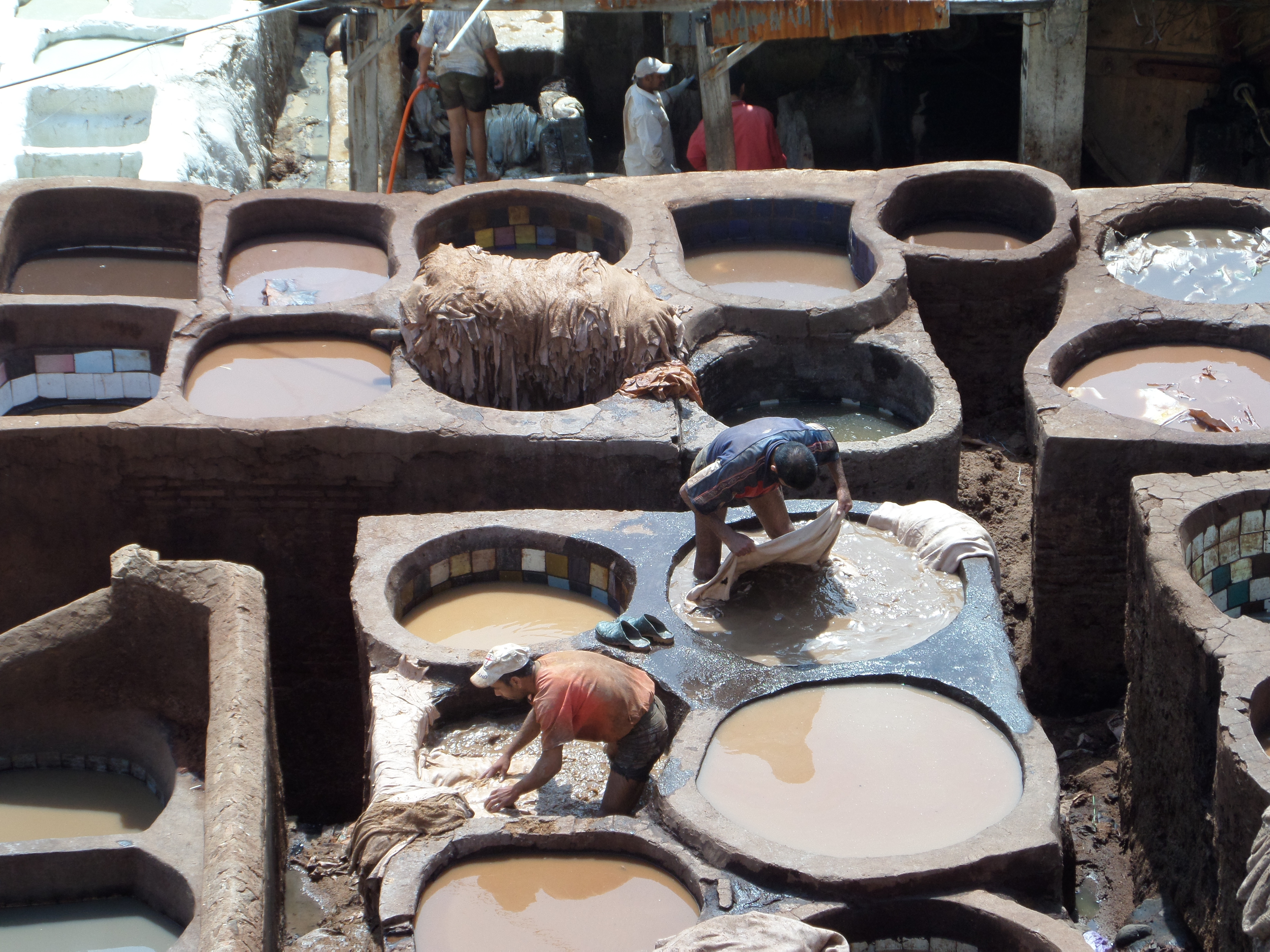 Mei, 2013; Eeuwen oude leerlooierij in de Medina van Fes. Het looiproces is in het kort als volgt. 1). Villen van huiden 2). Ontharen in kalkwater 3). Broeien op smartblok 4). Haren schrapen 5). Vlezen en 6). Looien in kuipen.