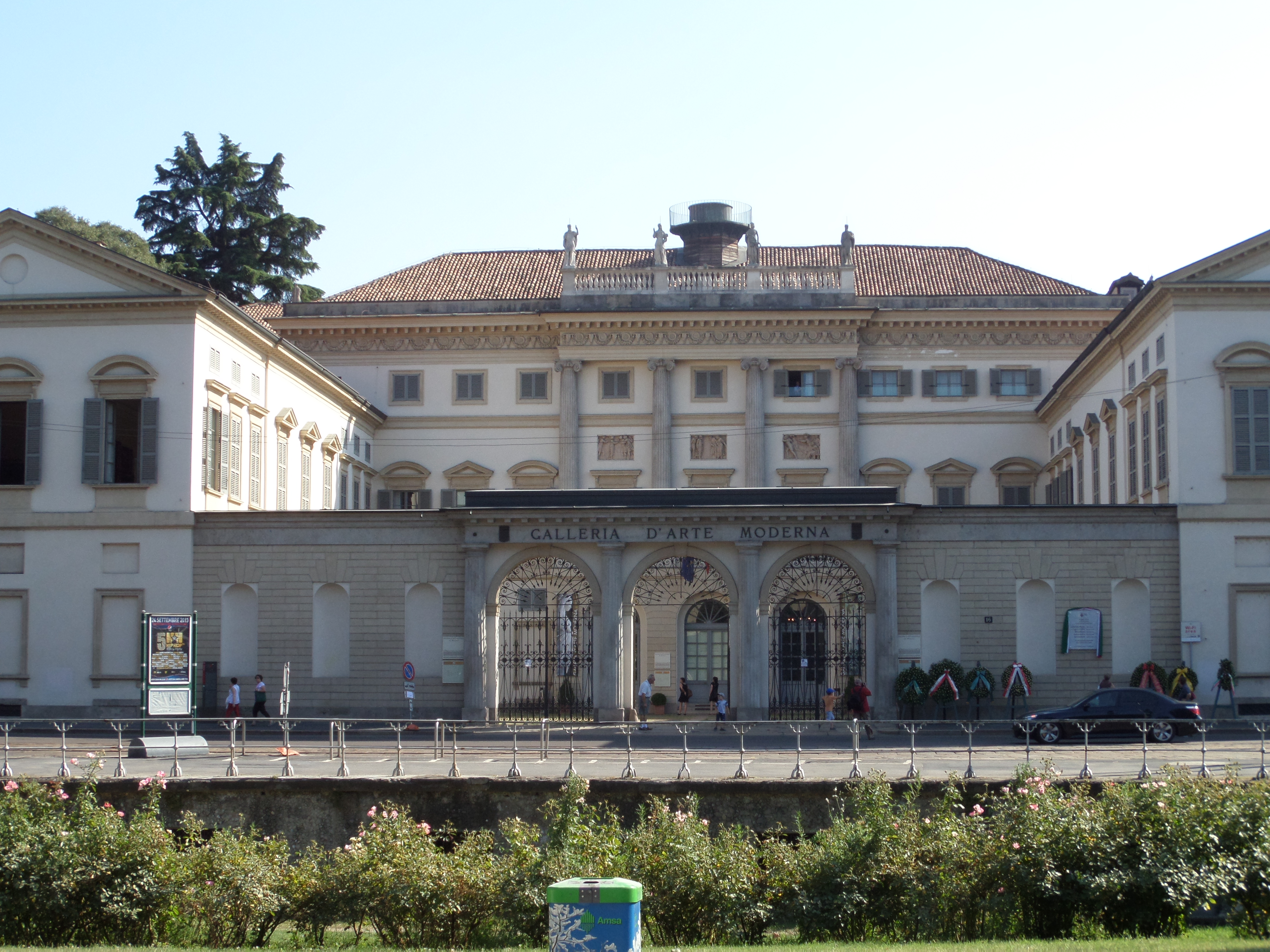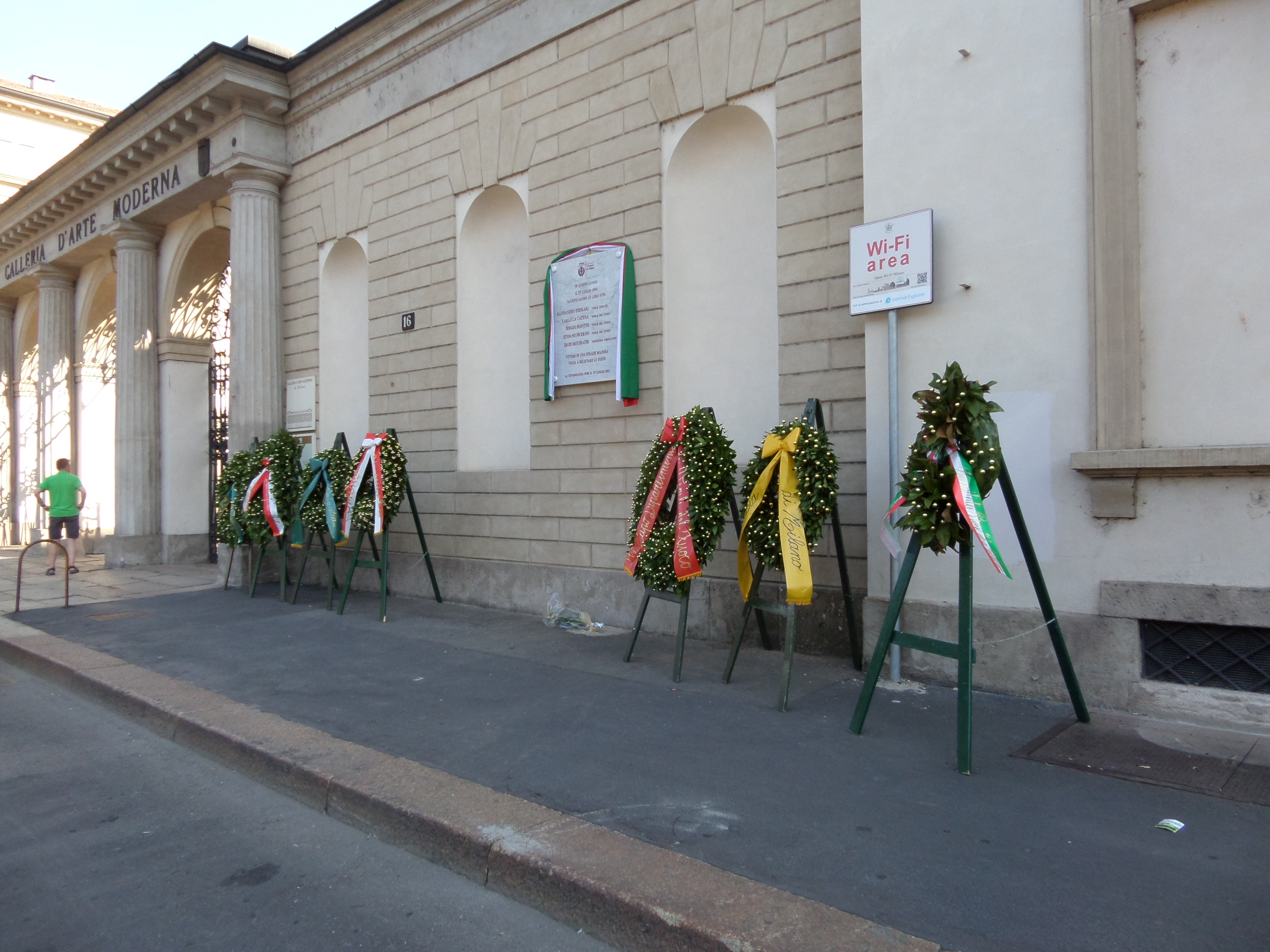 27 juli 2013: Kransen bij het Museum der Moderne Kunsten in Milaan. In de muur een herdenkingssteen met de namen van de slachtoffers van de aanslag op 27 juli 1993: Alesandro Ferrari, Carlo La Catena, Sergio Passotto, Stefano Picerno, Driss Moussafir. (foto: René Hoeflaak)