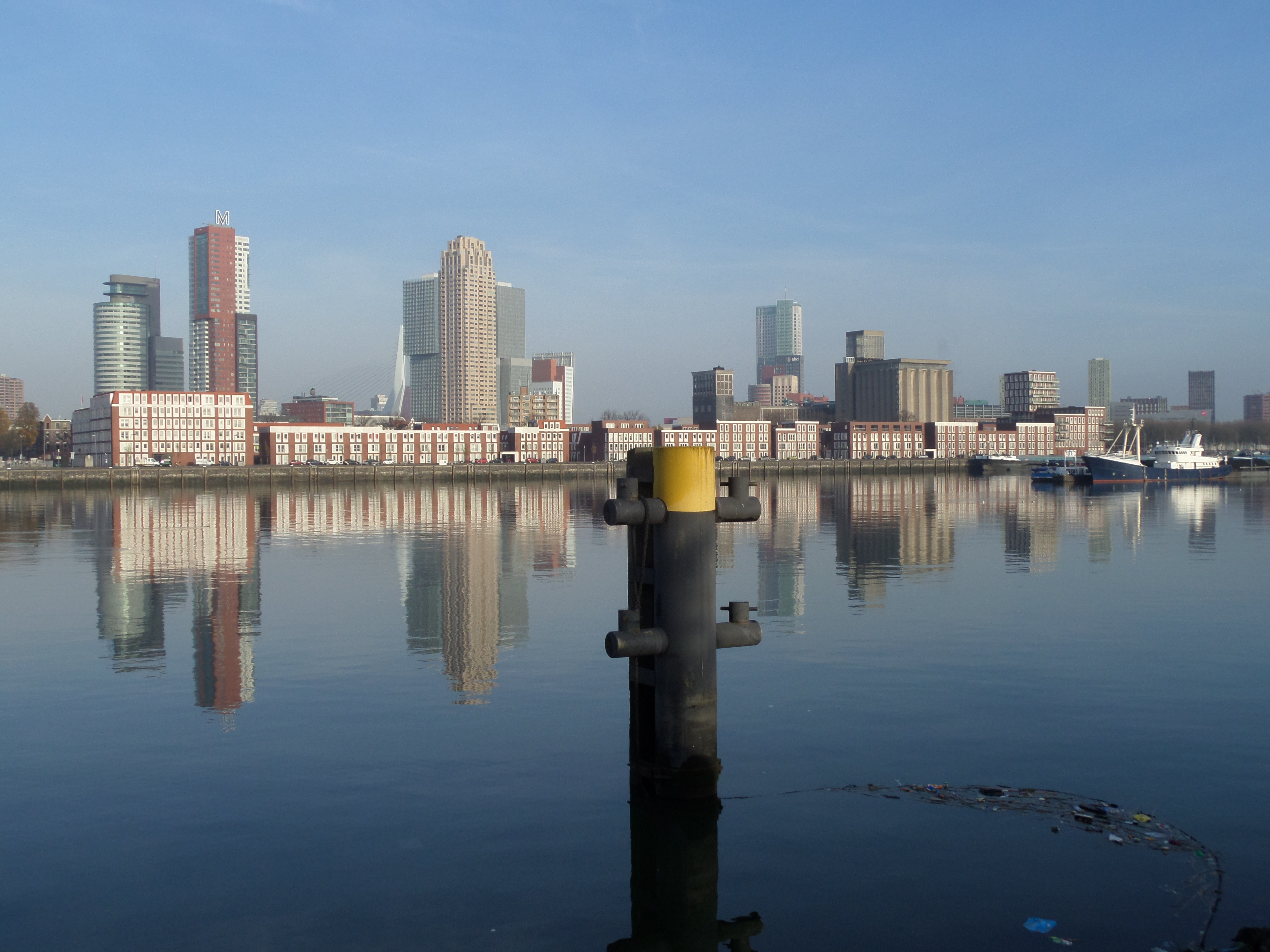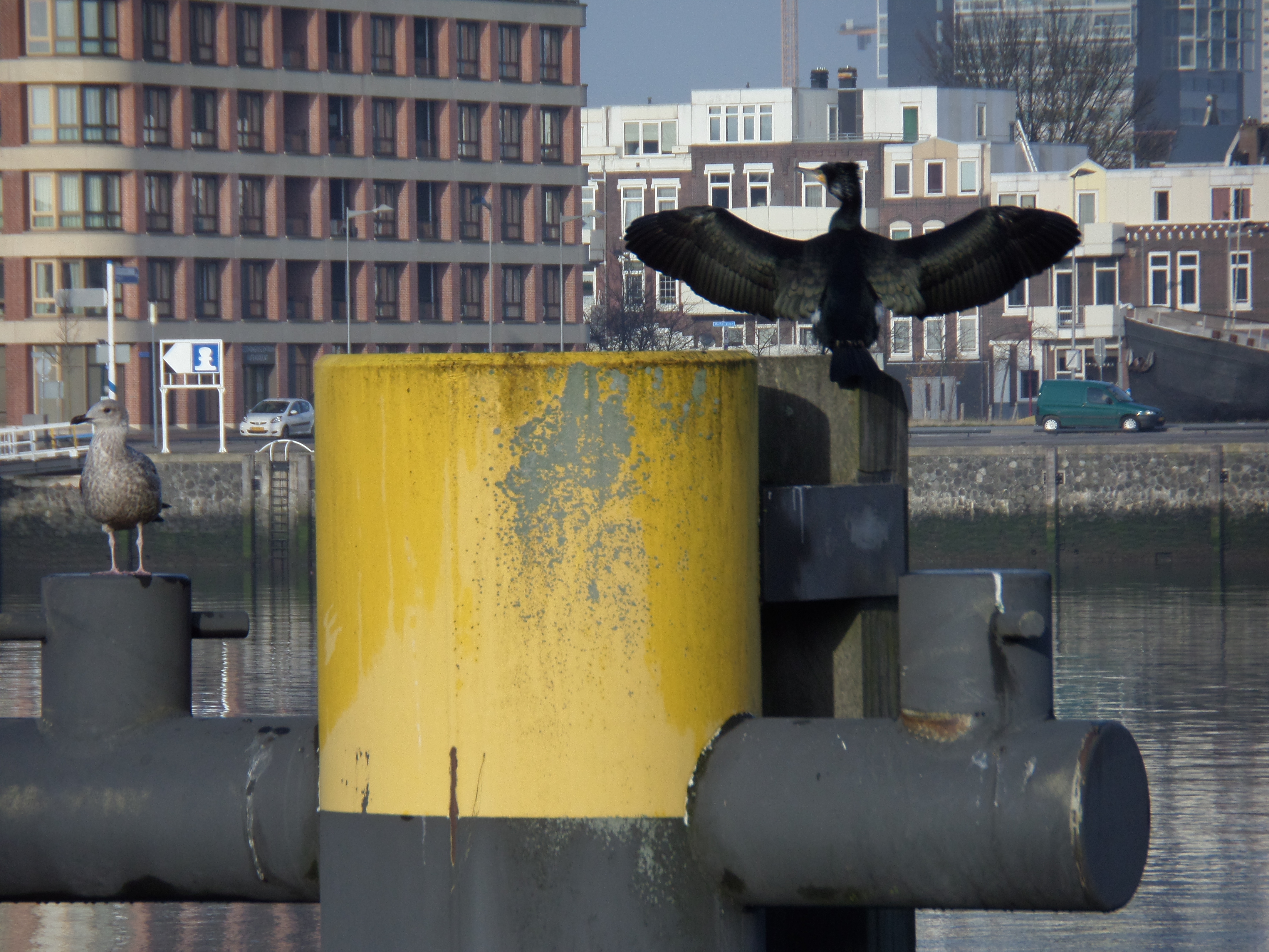 Storm, windkracht 9, slagregen, donker. Code oranje in Rotterdam. Tegen rood aan. Hoe anders was het nog maar 60 uur geleden. Strak blauwe hemel , zon, spiegelend rustig vaarwater. Eenden dobberen in de Rotterdamse stadshavens zoals de Rijnhaven en de Maashaven. Prima weer voor het drogen van aalscholvervleugels. Samen met de nijlgans, stamgast aan de oevers van de stadshavens.