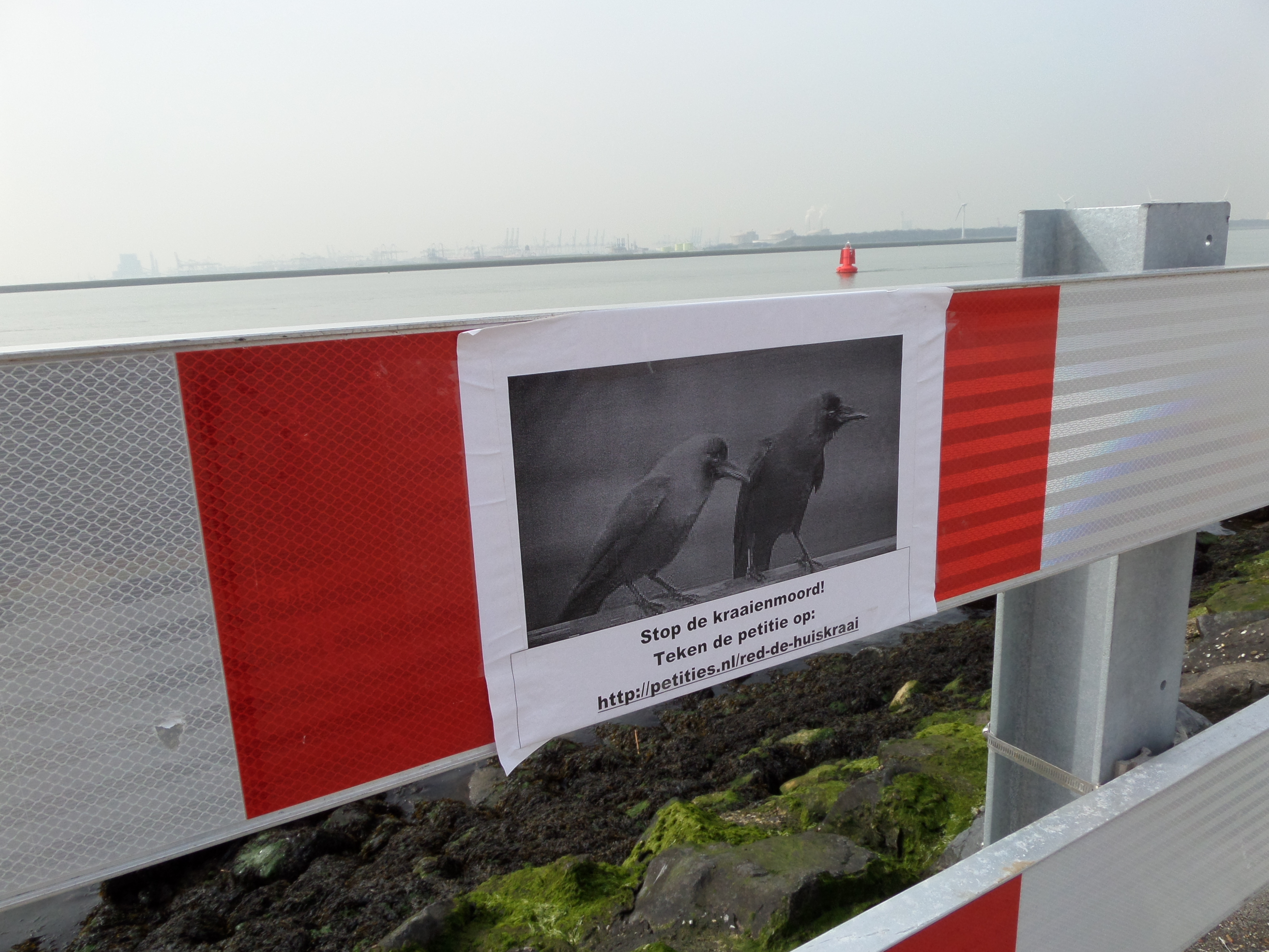 31 maart 2014, Hoek van Holland; Overal hangen oproepen om de Indische kraai te beschermen zoals hier aan de Nieuwe Waterweg. Tevergeefs. (foto: René Hoeflaak)