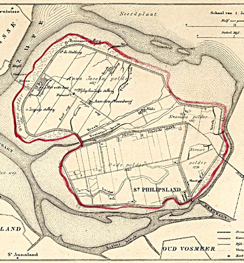 Kaart van Sint-Philipsland uit 1866. De rode lijn komt overeen met de omschreven wandeling (bron foto: http://www.geschiedeniszeeland.nl)