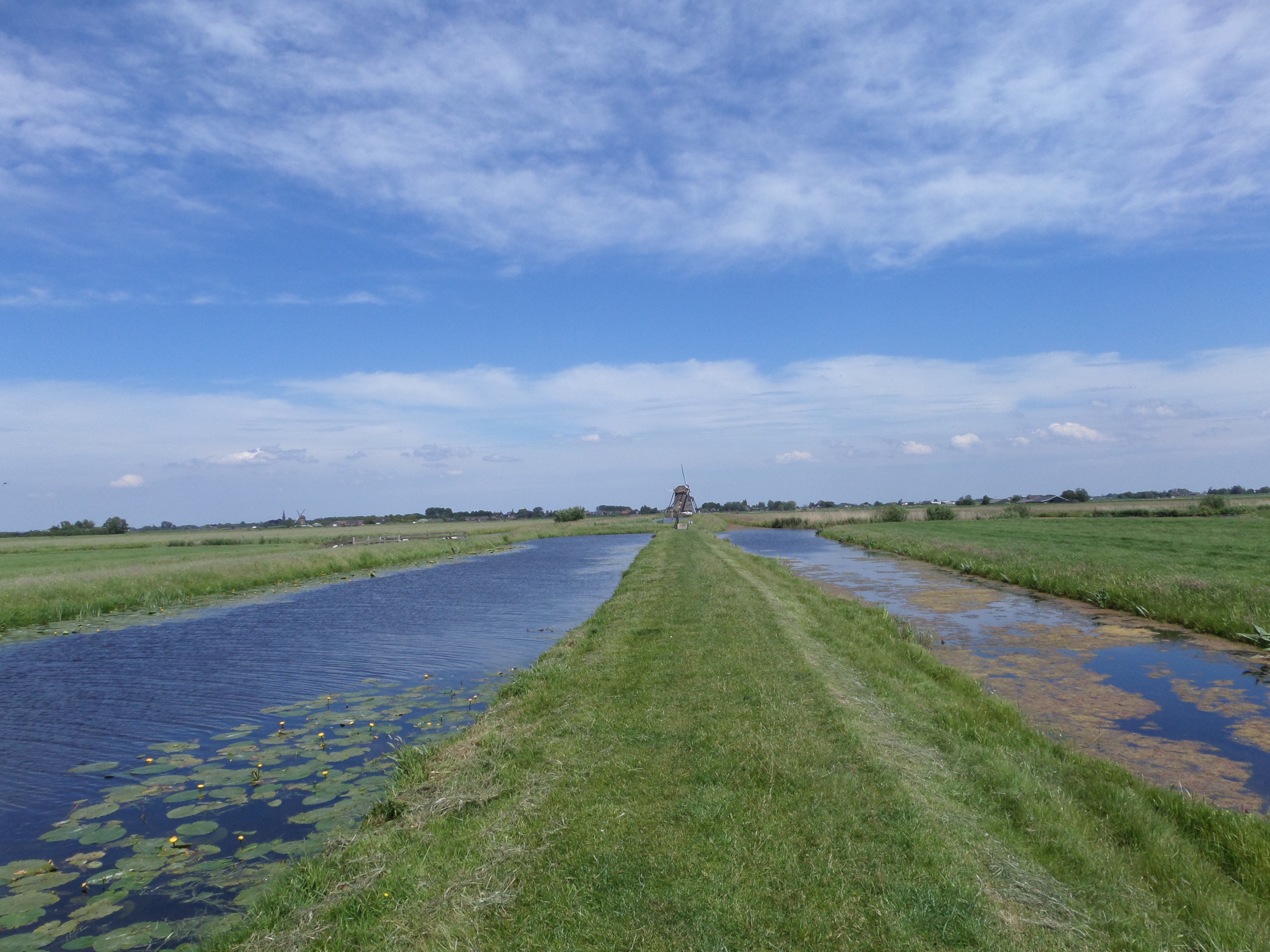 Bij Aarlanderveen, over een graspad langs drie van de vier molens vervolg ik mijn weg in de richting van Zwammerdam. Het is nog lente maar de temperatuur stijgt tot zomerse waarden. De lammetjes dartelen om mij heen. De Oude Rijn en Zwammerdam, de stad van het Romeinse fort Nigrum Pullum –zwarte grond- lonken. De Oude Rijn was eeuwen lang de grens van het Romeinse Rijk. Op de Zwammerdamse brug kijk ik terug. Naar vandaag, naar de gesloten ijsbaan en naar Pietje. Maar zelfs Pietje is niet meer te zien.