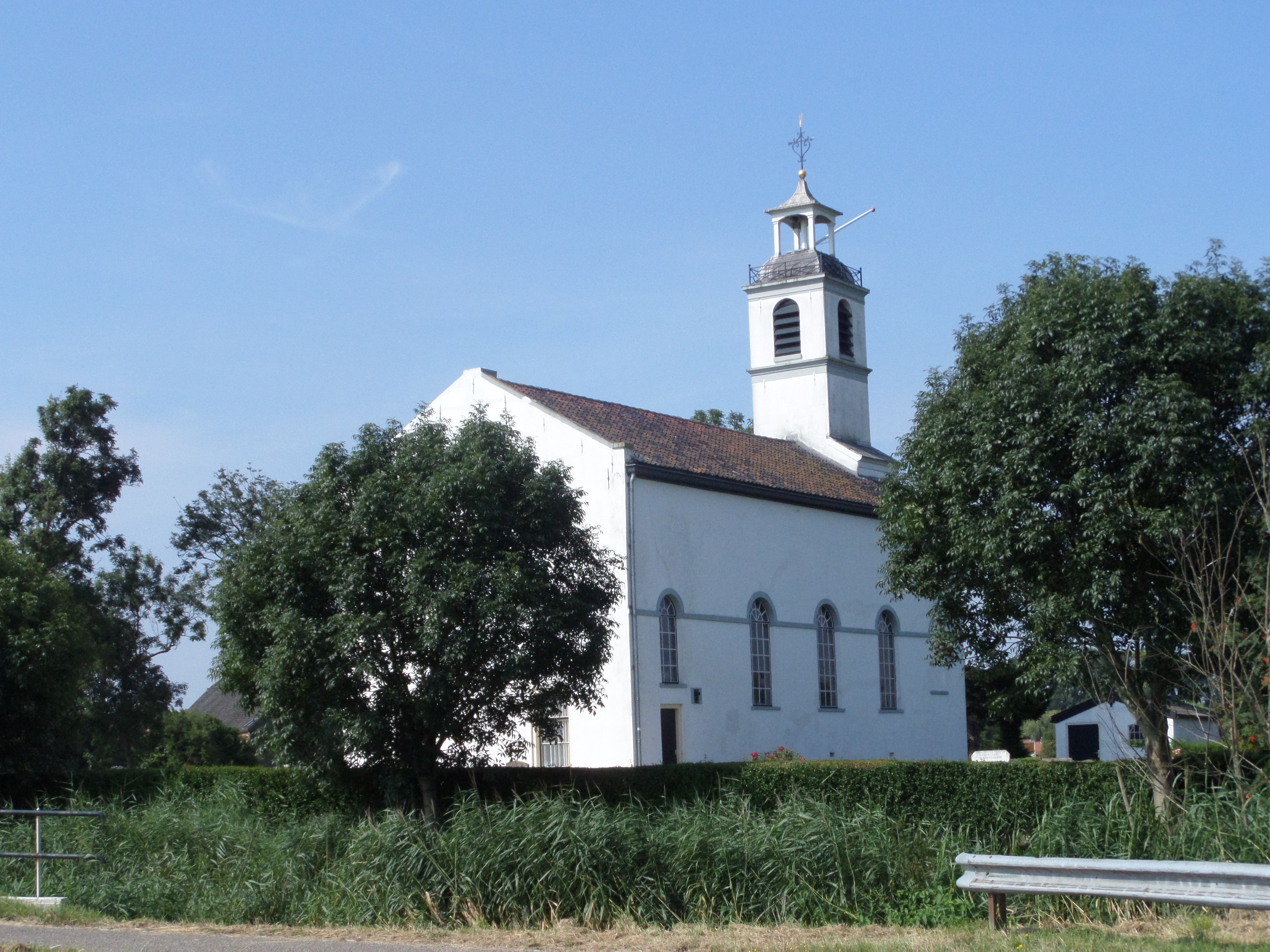 1 augustus 2014: Wit kerkje aan de rand van Simonshaven. Het kerkje is gebouwd op een vluchtheuvel ter bescherming tegen overstromingen op het eiland Putten (foto: René Hoeflaak)