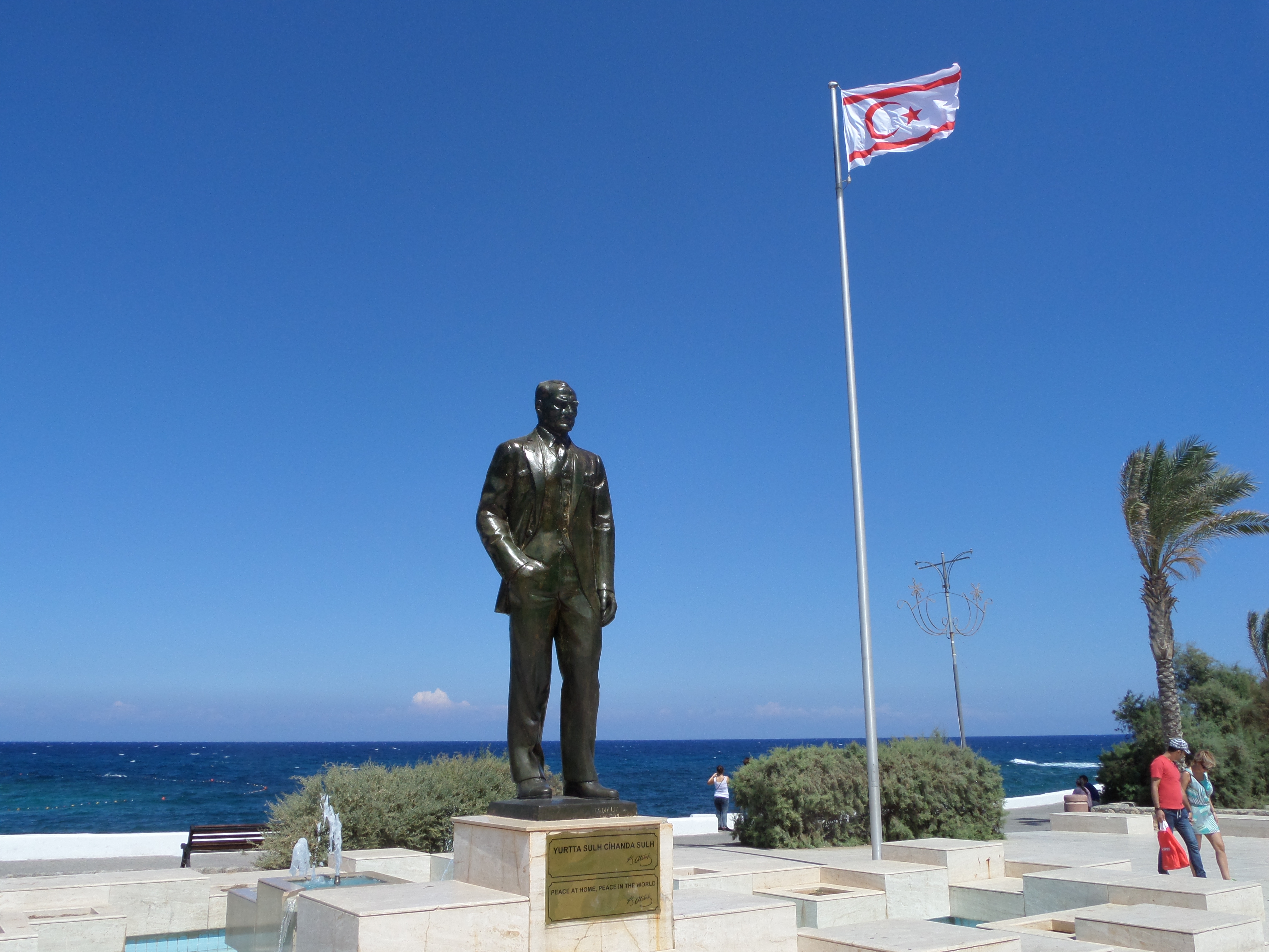 Cyprus, Girne; Cypriotische vlag met standbeeld van Mustafa Kemal Atatürk, de grondlegger van de Turkije (foto: René Hoeflaak)