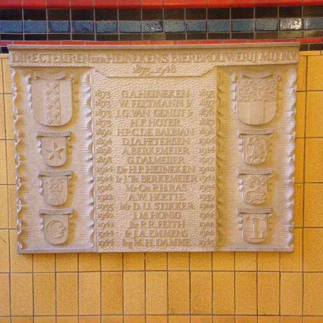 Ook in de entreehal op de begane grond: een gedenkplaat met de zeventien namen van de Heineken directeuren tussen 1873 en 1948, te beginnen met oprichter G.A. Heineken zelf en ergens halverwege de naam van H.P. Heineken, de vader van Freddy Heineken. Laatstgenoemde had in Crooswijk nog een eigen directiekamer.
