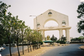 Banjul, 2005: Arch22. Monument ter ere van revolutie in 1994. (foto René Hoeflaak)Bij dit monument drukt iemand een zak snoep in mijn handen. Een aantal kinderen verdringen zich om mij heen om een duwen en trekken om een snoepje uit de zak. Bij de moskee is niets te beleven en het is het erg stil. Een moslim bij de moskee, tracht ons te bekeren. “Visiting the mosque, is the first step”. Daar is geen speld tussen te krijgen.