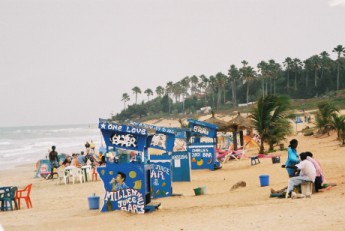 Kotu is een klein dorpje met enkele restaurants, geldwisselkantoren, hotels en een lokale markt. Al handen schuddend (het begint te wennen) lopen we door het dorpje naar de onverharde kustweg langs het strand. Op het strand hangen tientallen “vrije ondernemers” verveeld achter hun blauwe kraampjes met fruit- en frisdrankjes.