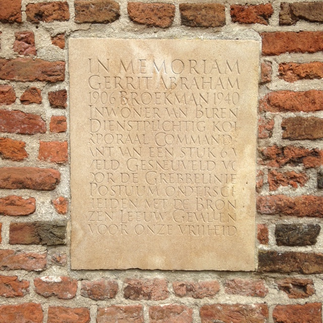 erug naar het terras en de kerk. Tijdens onze eigen wandeletappe van Geldermalsen naar Buren en terug drinken we op het genoemde terras een cappuccino. Naast mij het in mei 2003 onthulde standbeeld van Willem van Oranje met echtgenote Anna van Buren en hun kinderen Philips en Maria. Achter mij – in de kerkmuur- een gedenksteen met de tekst Gerrit Abraham Broekman., 1906-1940, dienstplichtig Korporaal. Inwoner van Buren en Postuum onderscheiden met de Bronzen Leeuw. Draaiend van links naar achteren overbrug ik op mijn terrasstoel zo maar vier eeuwen en twee markeerpunten in de Nederlandse geschiedenis.