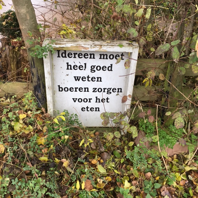 December 2016: ‘Iedereen moet hèèl goed weten, boeren zorgen voor het eten’. Teksten die ik las op een bord tussen de struiken langs een pad in de polders rondom Zoeterwoude Dorp. Op kniehoogte. Teksten die er niet om liegen. Stevige mannentaal in de polder.
