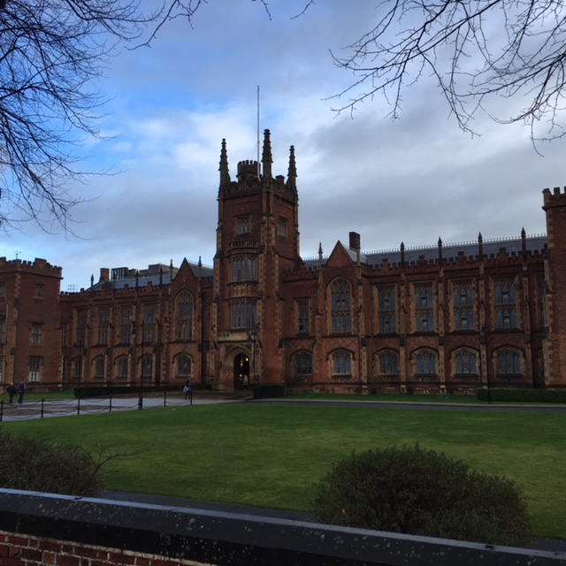 De bushalte voor het Ulster Museum staat voor het gebouw van de Queen’s University Het gebouw dateert uit 1849 en de aanblik van de Universiteit maakt het wachten in de eerder genoemde Noord-Ierse waterkou op de frequent stoppende en vertrekkende bussen richting het zuiden van de stad zelfs aangenaam.
