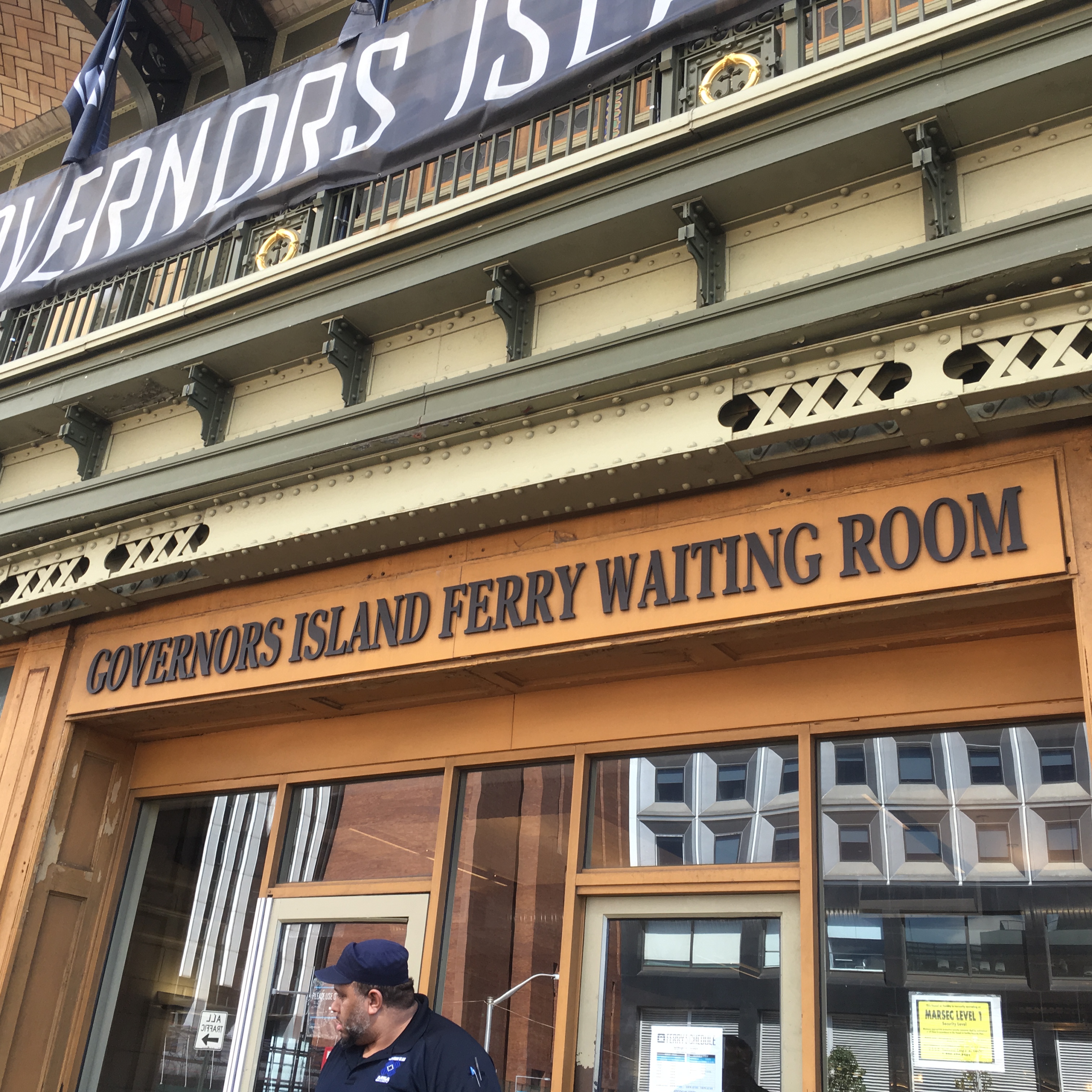 Niet alleen om aan de vrijdagmiddagdrukte op Manhattan te ontsnappen maar ook om het andere New York te ontdekken, kopen we in de Battery Maritime Building, de ruim honderd jaar oude monumentale terminal op de zuidpunt van Manhattan, voor 2 dollar een kaartje voor de ferry naar Governors Island.