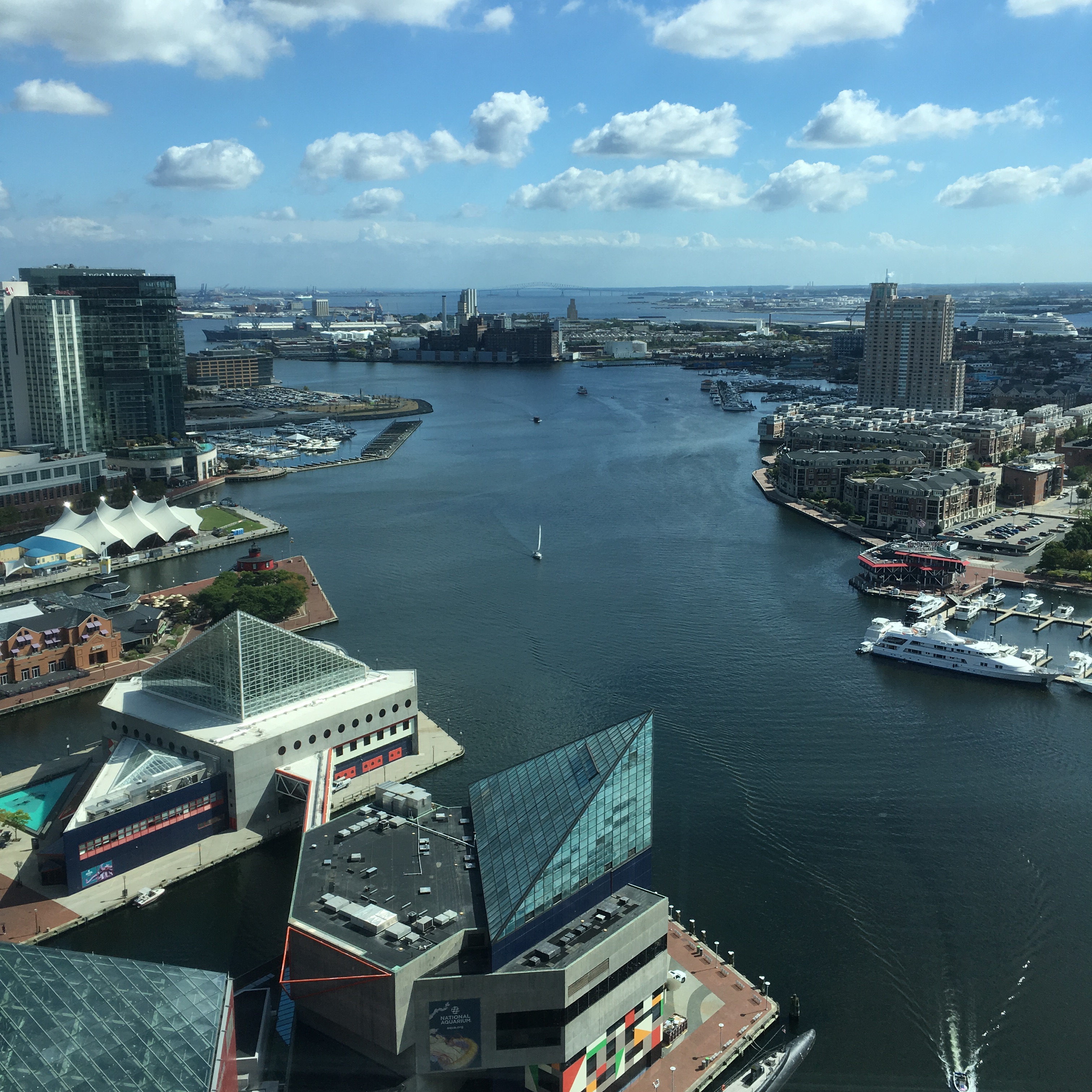 27 september 2017; uitzicht over de Inner Harbour van Baltimore vanaf de Top Of The World Observation Level (foto: René Hoeflaak)