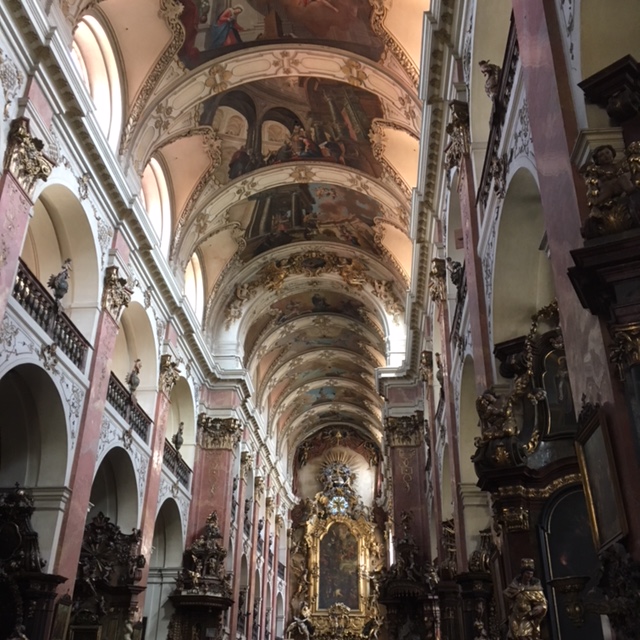 Vooral de binnenkant van de oorspronkelijk gotische kerk is zeer de moeite waard. De plafondschilderingen, marmeren pilaren en het gedetailleerde stucwerk maken indruk. Althans op mij. Barokstijl zoals de barokstijl bedoeld is. De kerk werd in de 13e eeuw gebouwd in opdracht van koning Wenceslaus I. Volgens mij niet de Wencesclaus naar wie het bekende plein is vernoemd.